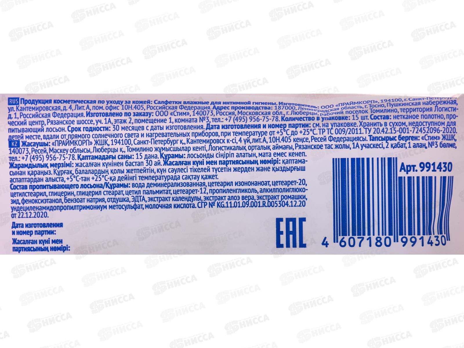 Новые Горизонты влажные салфетки для интимной гигиены 15шт *48