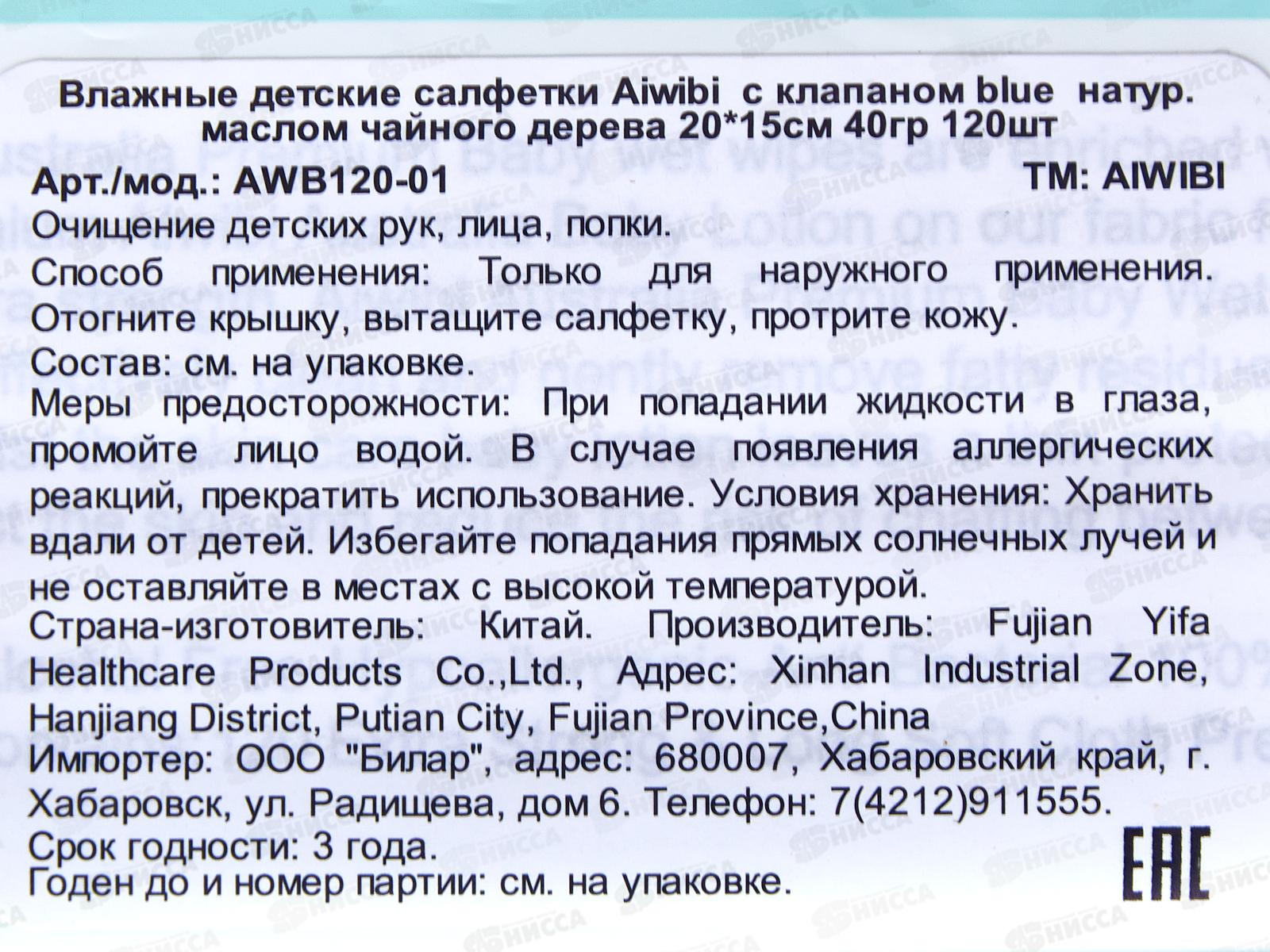 Aiwibi влажные салфетки детские Очищающие Чайное дерево 120шт клапан *18