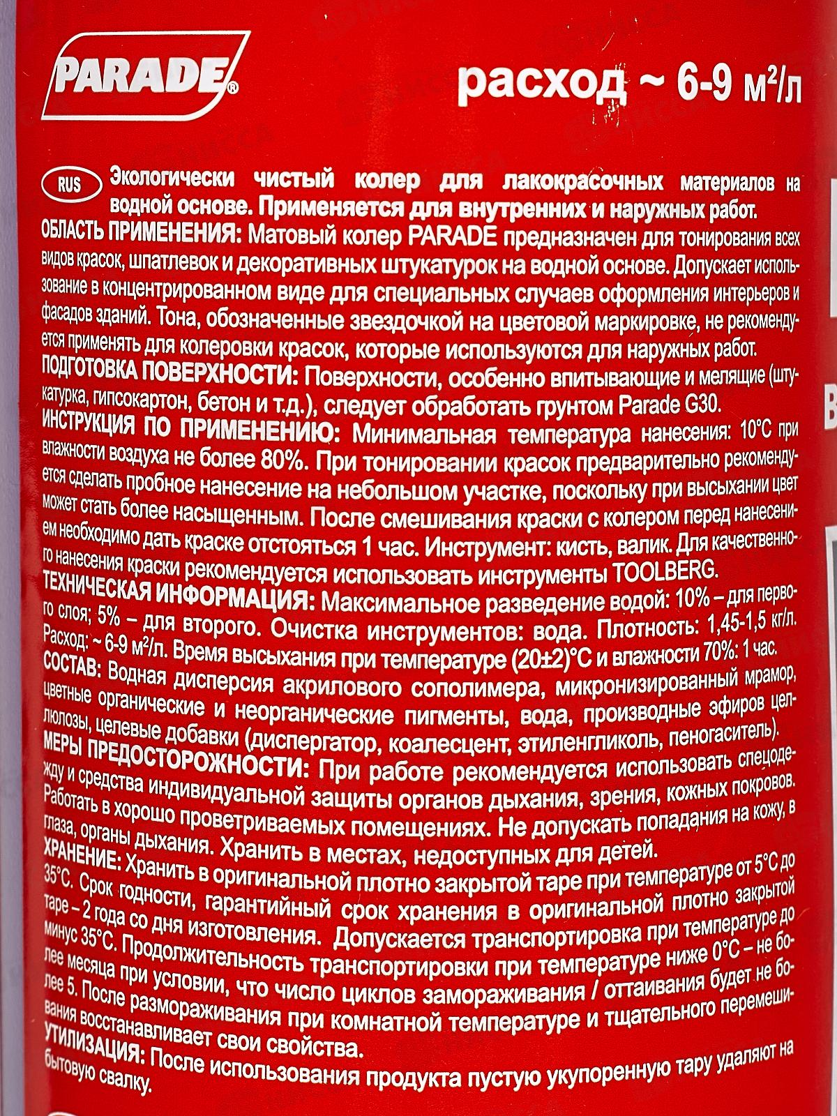 Экологически чистый колер для лакокрасочных материалов на водной основе. Для внутренних и наружных работ. Предназначен для тонирования всех видов красок, шпатлевок и декоративных штукатурок на водной основе. Допускает использование в концентрированном виде для специальных случаев оформления интерьеров и фасадов зданий. Тона, обозначенные звездочкой на цветовой маркировке, не рекомендуется применять для колеровки красок, которые используются для наружных работ. Обладает отличной атмосферостойкостью, светостойкостью, прочностью к истиранию При тонировании красок предварительно рекомендуется сделать пробное нанесение на небольшом участке, поскольку при высыхании цвет может стать более насыщенным.