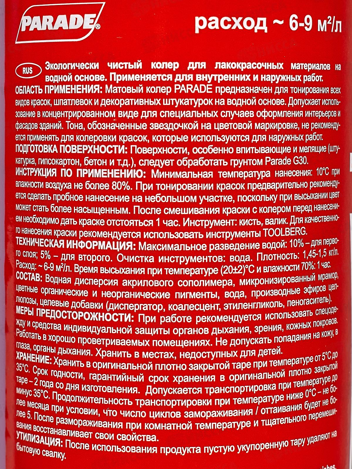 Экологически чистый колер для лакокрасочных материалов на водной основе. Для внутренних и наружных работ. Предназначен для тонирования всех видов красок, шпатлевок и декоративных штукатурок на водной основе. Допускает использование в концентрированном виде для специальных случаев оформления интерьеров и фасадов зданий. Тона, обозначенные звездочкой на цветовой маркировке, не рекомендуется применять для колеровки красок, которые используются для наружных работ. Обладает отличной атмосферостойкостью, светостойкостью, прочностью к истиранию При тонировании красок предварительно рекомендуется сделать пробное нанесение на небольшом участке, поскольку при высыхании цвет может стать более насыщенным.