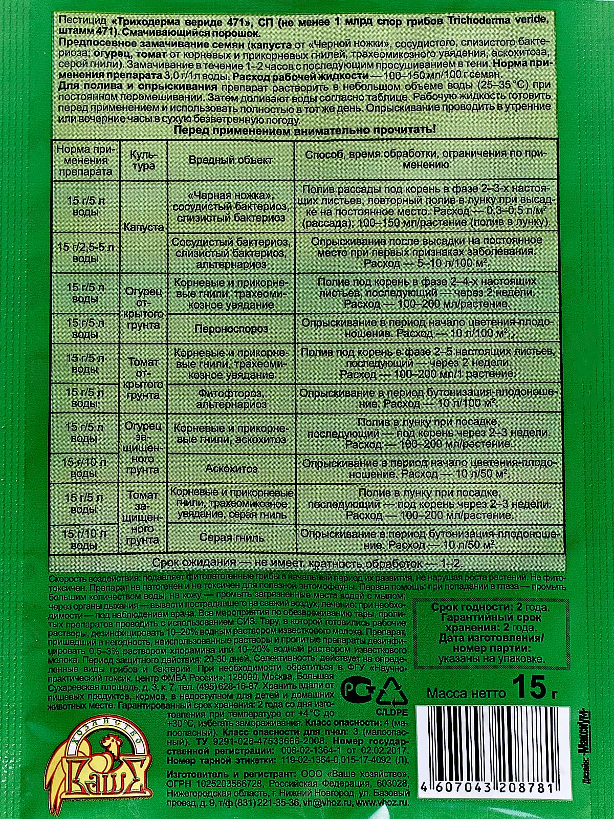 Эффективный биопрепарат для защиты растений от болезней. В его основе — дружественные культурным растениям микроскопические грибы, подавляющие более 60 видов болезнетворных микробов. Защищает от корневых и плодовых гнилей, черной ножки, белой и серой гнили, макроспориоза, фузариоза, фитофтороза, антракноза, вилта и др. Попадая во влажную почву, споры «Триходермы» прорастают, выделяя природные «антибиотики» и обеззараживая почву вокруг. При этом препарат обладает длительным действием: уничтожает покоящиеся и зимующие стадии патогенов. Попадая на поврежденный участок больного растения, споры прорастают, питаясь больной тканью, и одновременно лечат растение.