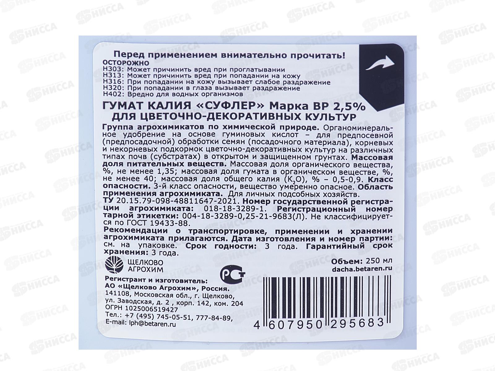 Гумат калия "Суфлер" марка ВР 2,5% цветочно-декоративные 250мл органоминеральное удобрение