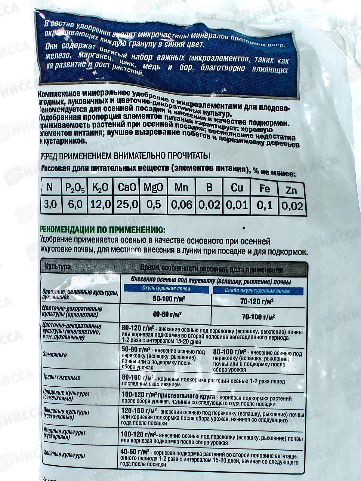 Универсальное удобрение для садово-огородных культур. Повышает устойчивость растений к неблагоприятным факторам в зимний период. Стимулирует рост коневой системы. Обеспечивает закладку дополнительных цветочных и плодовых почек. Питательные элементы: азот – 3, фосфор – 6, калий – 12, магний - 0,5, железо - 0,1, марганец - 0.05, бор - 0,01, медь - 0,01, цинк - 0,01.