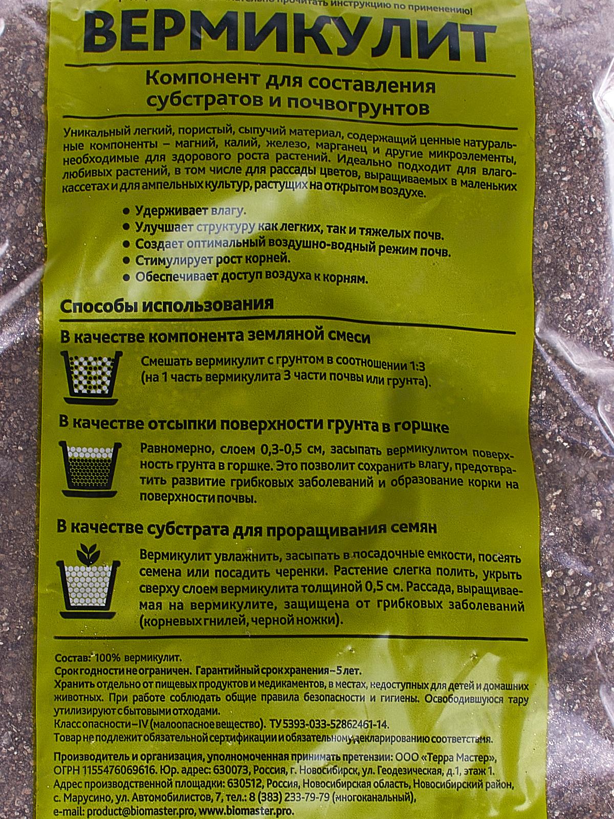 Вермикулит — это пористый природный минерал из группы гидрослюд, образующийся вследствие вымывания и выветривания биотитовой слюды. Содержит в составе разнообразные микроэлементы, но не включает тяжелые металлы и токсичные компоненты. Средство широко применяется в садоводстве и цветоводстве, где вермикулит используется, как в чистом виде, так и с торфяно-песочной смесью. Рекомендуется купить состав для проращивания семян, которые будут равномерно увлажнены и дадут высокий процент всходов. Преимущества: насыщает почву полезными минералами, даёт эффект равномерного увлажнения, предохраняет от затвердевания верхнего слоя почвы.