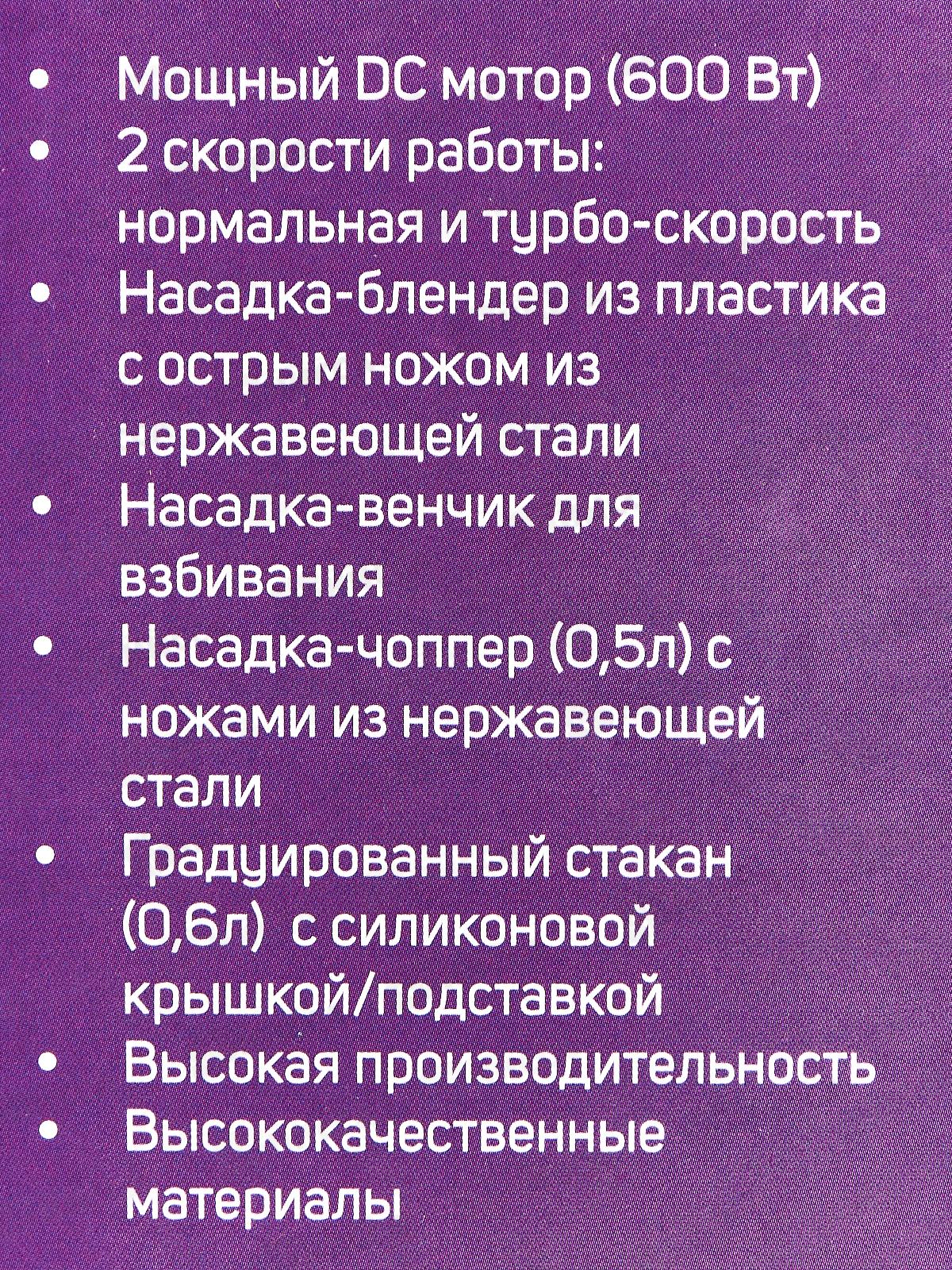 Комплектация: погружная часть, насадка-венчик, стакан 0,6 л, чоппер 0,5 л