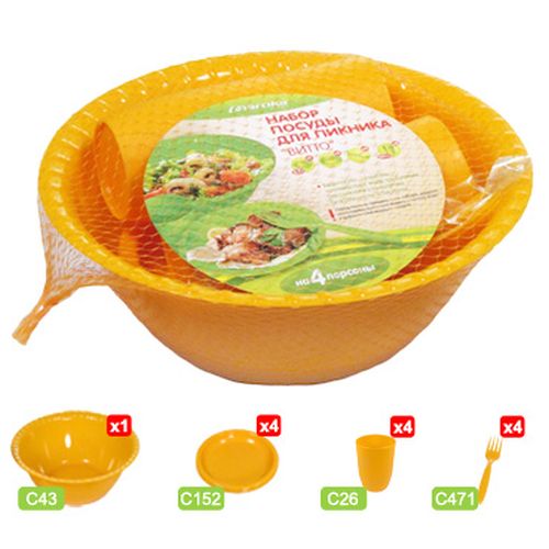 Набор посуды для пикника «Витто» на 4 персоны, состоит из 13 предметов: миска-салатница 2,5л (1шт), тарелки для вторых блюд (4шт), вилки (4шт), стаканы для холодных напитков (4 шт). Посуда выполнена из качественного пищевого пластика и разрешена для контакта с пищевыми продуктами.