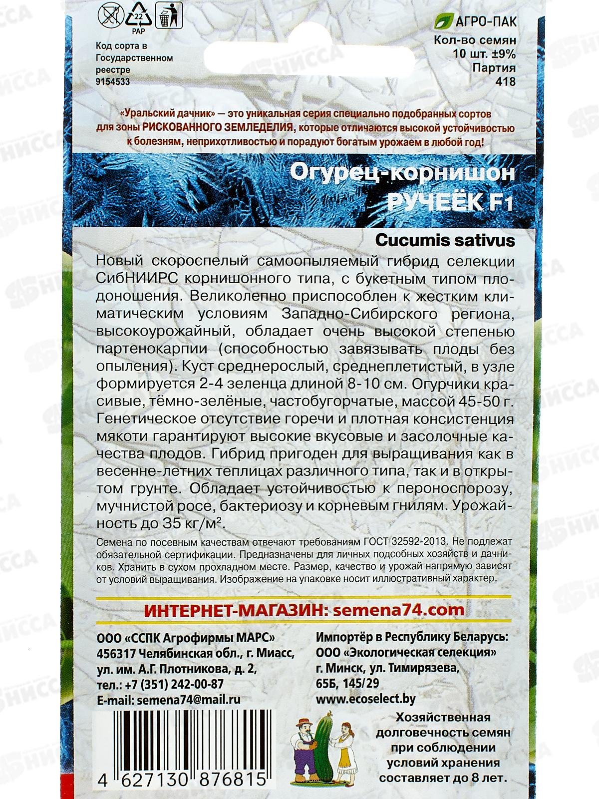 Огурец Ручеек F1 корнишон Евро *10 УрД +
