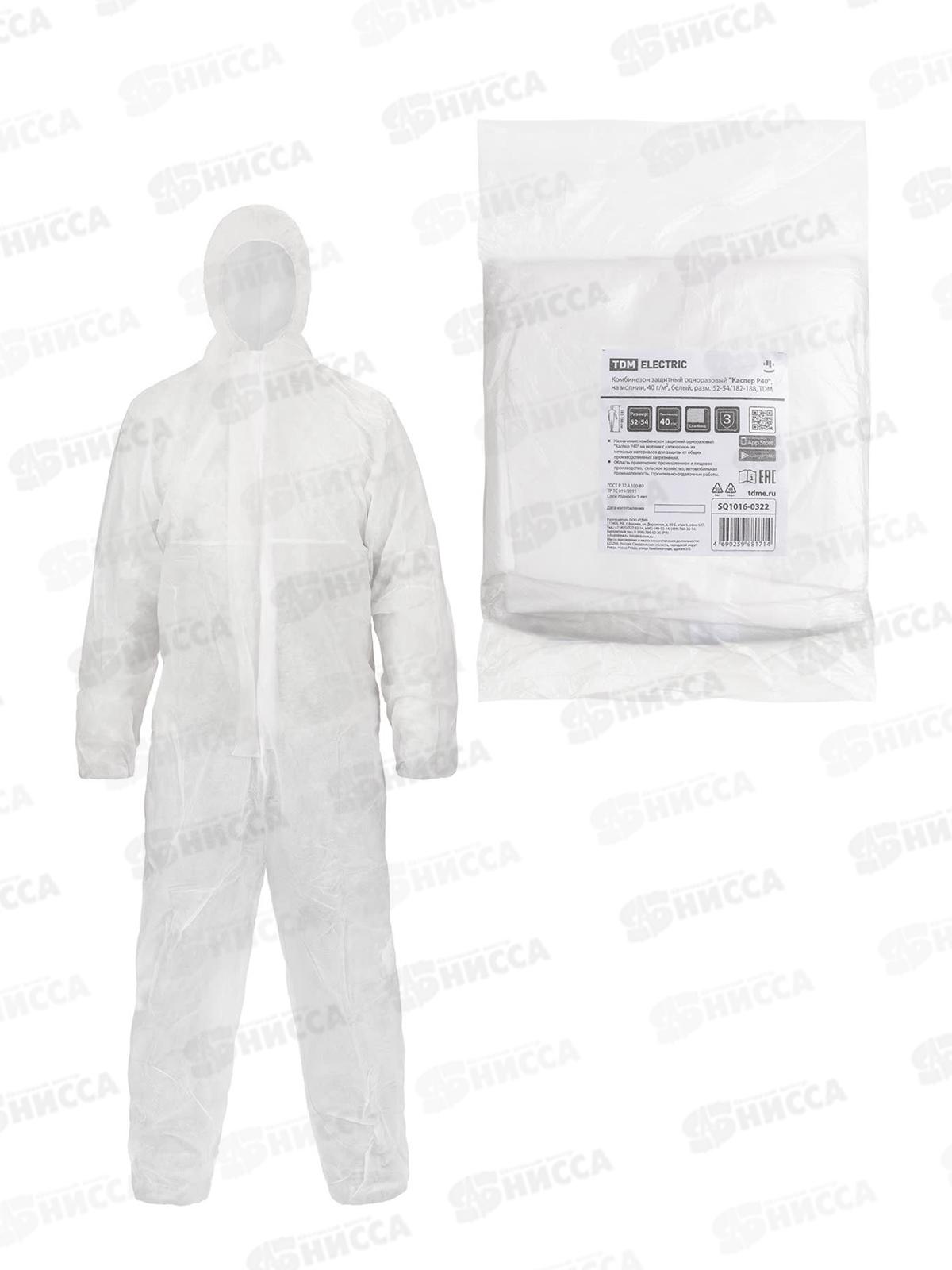 Комбинезон защитный одноразовый "Каспер Р40", на молнии, 40 г/м2, белый, разм. 52-54/182-188, 0322 *40