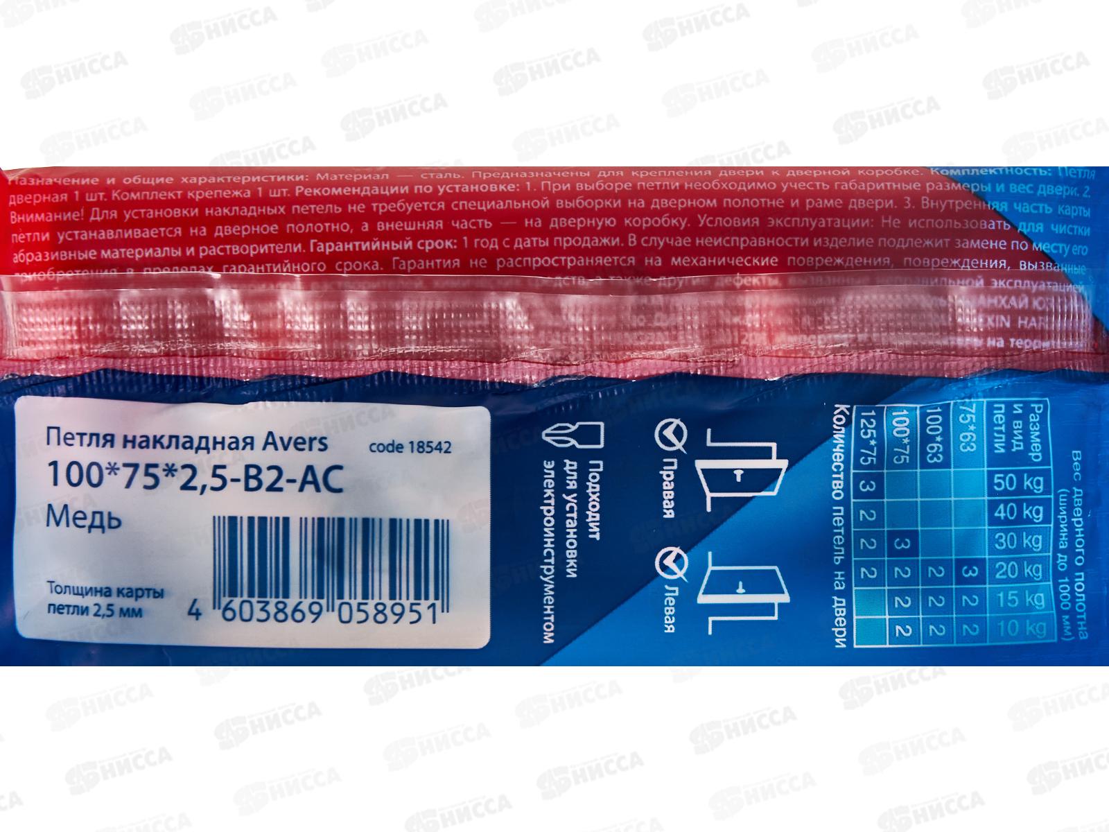 Петля-бабочка 100*75*2,5-B2-AC Avers 313809 Медь