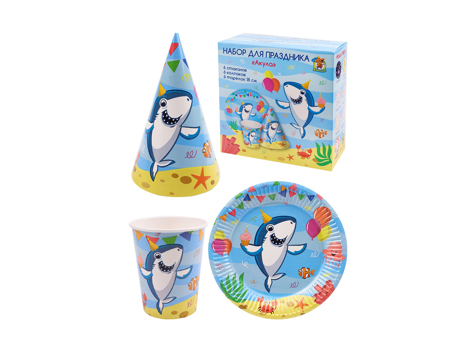 Набор для праздника Акула (тарелка 6шт, стаканы 6, колпаки 6) ФЛ-0946