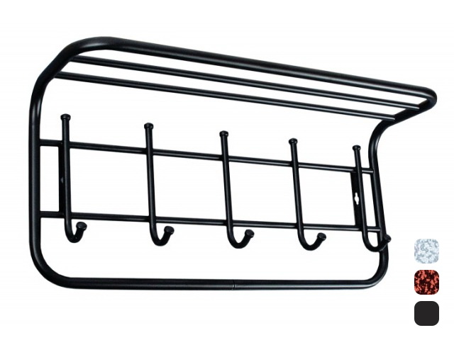 Настенная вешалка ЗМИ с полкой 60 см на 5 крючков черного цвета. Вешалка рассчитана размещения одежды и головных уборов. Можно использовать любых помещениях-дом, офис, общепит. Стальная труба диаметром 10 и 16 мм. Стальные колпачки. Полимерно-порошковое покрытие. Надежная сварная конструкция.