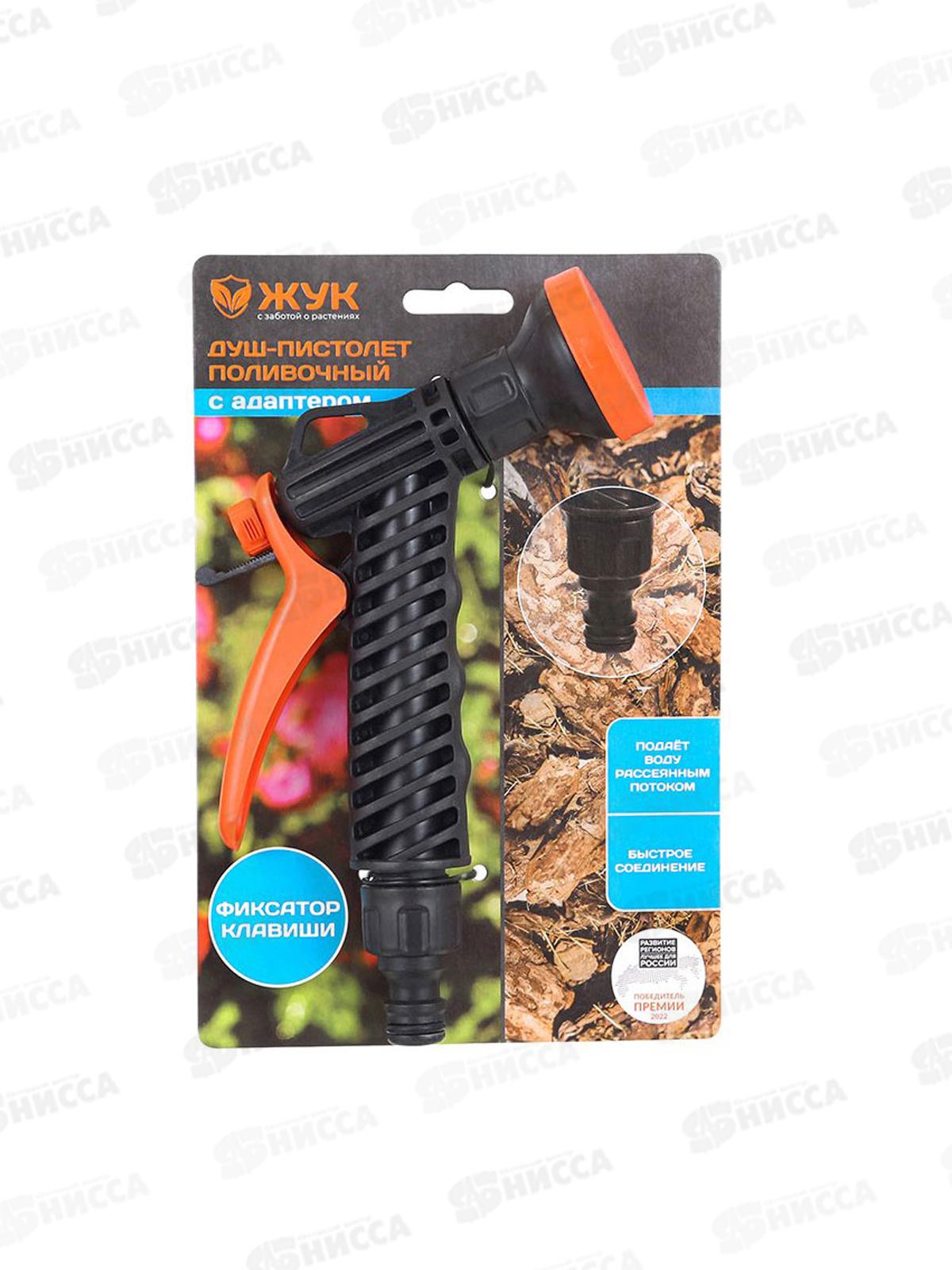 Душ-пистолет поливочный ЖУК, с адаптером для подключения коннектора. Применяется для полива и орошения растений и кустарников, промывки садовых емкостей, а также мелкомасштабной уборки инвентаря. В комплекте с пистолетом идет адаптер для подключения коннектора. Принцип работы - полив начинается при нажатии на клавишу.Душ-пистолет благодаря мелким отверстиям в распылителе идеально подходит для щадящего полива небольших растений. Душ-пистолет подаёт воду рассеянным потоком без возможности регулировки. Предусмотрен фиксатор клавиши в рабочем положении.