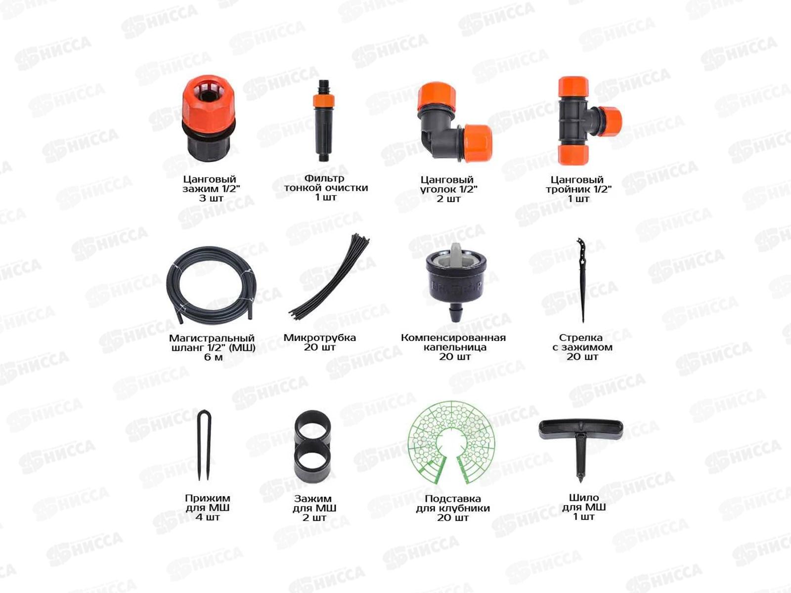 Автоматический полив на 20 растений подходит для одной грядки 4х1 м при посадке клубники в 2 ряда. Комплектация: цанговый зажим 1/2" - 3 шт, фильтр тонкой очистки - 1 шт, цанговый уголок 1/2" - 2 шт, цанговый тройник 1/2" - 1 шт, шланг магистральный 1/2" - 6 м, микротрубка от водопровода 40 см - 20 шт, компенсированная капельница - 20 шт, стрелка с зажимом - 20 шт, прижим для магистрального шланга - 4 шт, зажим для магистрального шланга - 2 шт, подставка для клубники - 20 шт, шило для магистрального шланга - 1 шт.
