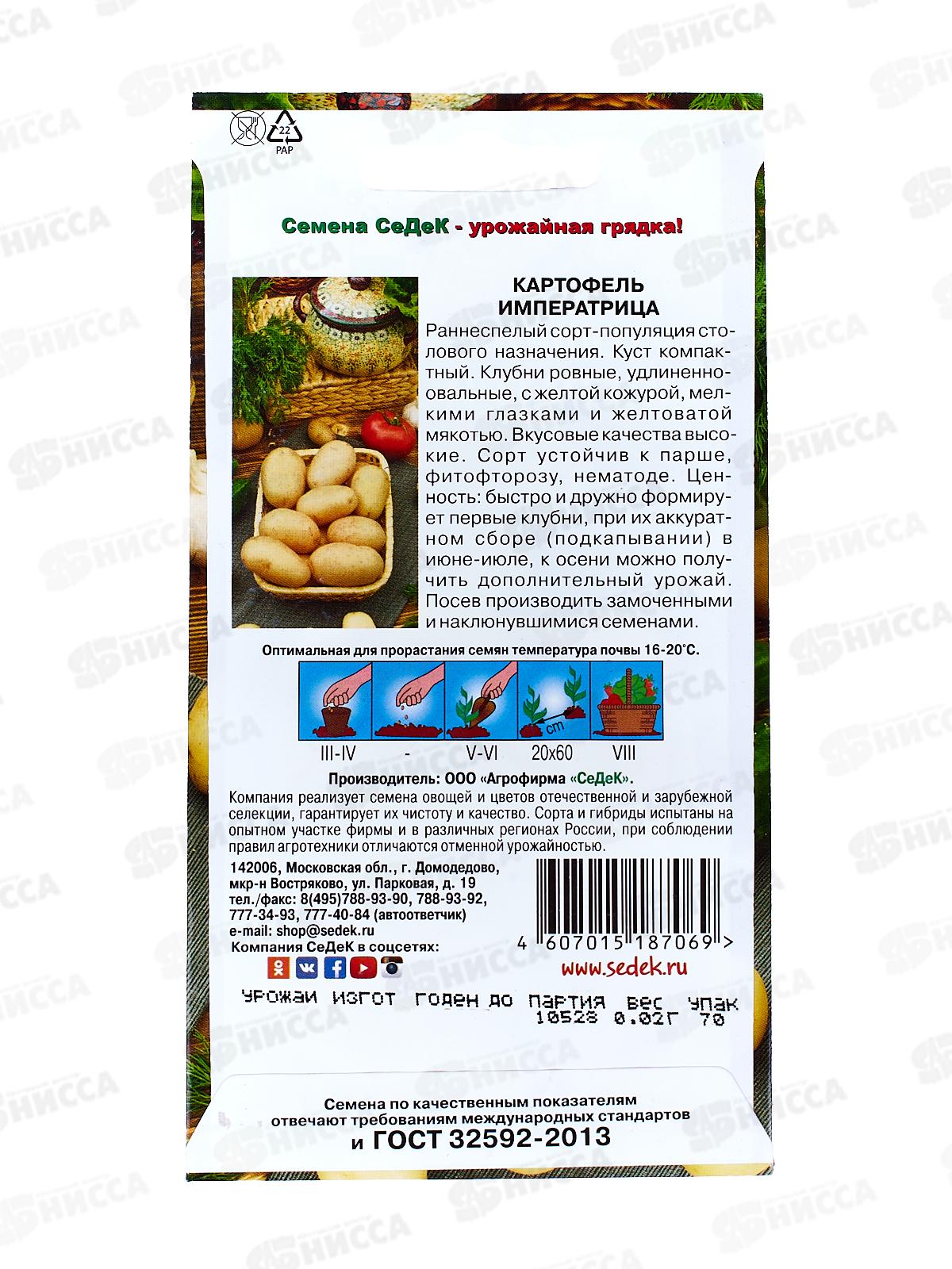 Раннеспелый сорт-популяция столового назначения. Куст компактный. Клубни ровные, удлиненно-овальные, с желтой кожурой, мелкими глазками и желтоватой мякотью. Вкусовые качества высокие. Сорт устойчив к парше, фитофторозу, нематоде. Ценность: быстро и дружно формирует первые клубни, при их аккуратном сборе (подкапывании) в июне-июле, к осени можно получить дополнительный урожай. Посев производить замоченными и наклюнувшимися семенами.