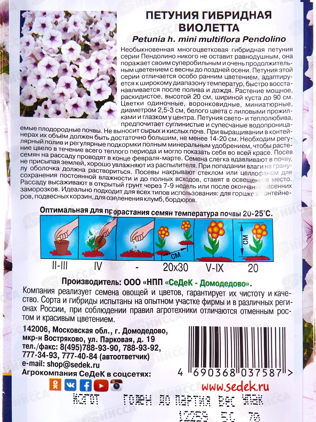 Необыкновенная многоцветковая гибридная петуния серии Пендолино никого не оставит равнодушным, она поражает своим суперобильным и очень продолжительным цветением с весны до поздней осени. Петуния этой серии отличается особо ранним цветением, адаптируется к широкому диапазону температур, быстро восстанавливается после полива и дождя. Растение мощное, раскидистое, высотой 20 см, шириной куста до 90 см. Цветки одиночные, воронковидные, миниатюрные, диаметром 2,5-3 см, белого цвета с лиловыми прожилками и глазком у центра. Петуния свето- и теплолюбива, предпочитает суглинистые и супесчаные водопроницаемые плодородные почвы. Не выносит сырых и кислых почв. При выращивании в контейнерах их объём должен быть достаточно большим, не менее 14-20 см. Необходим регулярный полив и регулярные подкормки полным минеральным удобрением, чтобы растение цвело в течение всего теплого периода и могло показать себя во всей красе. Посев семян на рассаду проводят в конце февраля-марте. Семена слегка вдавливают в почву, не присыпая землей, хорошо увлажняют из распылителя. При попадании влаги на гранулу оболочка должна раствориться. Посевы накрывают стеклом или целлофаном для сохранения постоянной влажности и до полных всходов, ставят в освещенное место. Рассаду высаживают в открытый грунт через 7-9 недель или после окончания весенних заморозков. Идеально подходит для всех типов использования: для горшков, контейнеров, подвесных корзин, для озеленения клумб, бордюров.