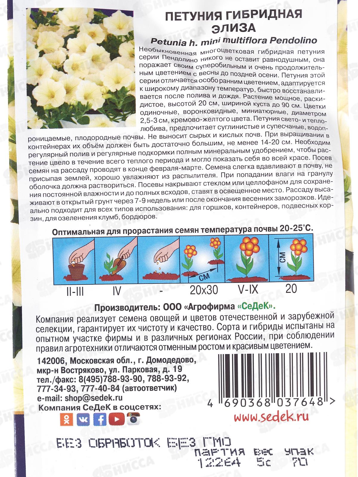Необыкновенная многоцветковая гибридная петуния серии Пендолино никого не оставит равнодушным, она поражает своим суперобильным и очень продолжительным цветением с весны до поздней осени. Петуния этой серии отличается особо ранним цветением, адаптируется к широкому диапазону температур, быстро восстанавливается после полива и дождя. Растение мощное, раскидистое, высотой 20 см, шириной куста до 90 см. Цветки одиночные, воронковидные, миниатюрные, диаметром 2,5-3 см, кремово-желтого цвета. Петуния свето- и теплолюбива, предпочитает суглинистые и супесчаные водопроницаемые плодородные почвы. Не выносит сырых и кислых почв. При выращивании в контейнерах их объём должен быть достаточно большим, не менее 14-20 см. Необходим регулярный полив и регулярные подкормки полным минеральным удобрением, чтобы растение цвело в течение всего теплого периода и могло показать себя во всей красе. Посев семян на рассаду проводят в конце февраля-марте. Семена слегка вдавливают в почву, не присыпая землей, хорошо увлажняют из распылителя. При попадании влаги на гранулу оболочка должна раствориться. Посевы накрывают стеклом или целлофаном для сохранения постоянной влажности и до полных всходов, ставят в освещенное место. Рассаду высаживают в открытый грунт через 7-9 недель или после окончания весенних заморозков. Идеально подходит для всех типов использования: для горшков, контейнеров, подвесных корзин, для озеленения клумб, бордюров.