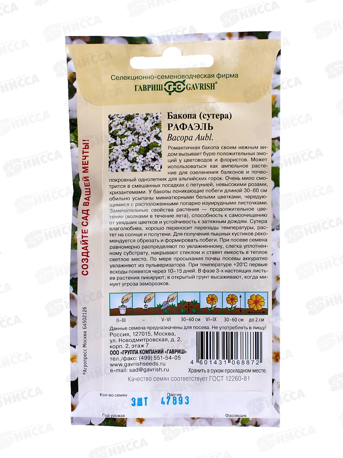 У бакопы поникающие побеги длиной 30-60 см обильно усыпаны миниатюрными фиолетовыми цветками, чередующимися с расположенными попарно изумрудными листочками. Замечательные свойства растения - продолжительное цветение (волнами в течение лета), способность к самоочищению от увядших цветков и устойчивость к затяжным дождям. Бакопа влаголюбива, хорошо переносит перепады температуры, растет на солнце и в полутени. Для получения пышных кустиков рекомендуется обрезать и формировать побеги. При посеве семена равномерно распределяют по увлажненному, слегка уплотненному субстрату, накрывают стеклом и ставят емкость в теплое светлое место. По мере просыхания почвы посевы аккуратно увлажняют из пульверизатора. При температуре 20С первые всходы появятся через 10-15 дней. В фазе 3-х настоящих листьев растения пикируют, в открытый грунт высаживают, когда минует угроза заморозков.