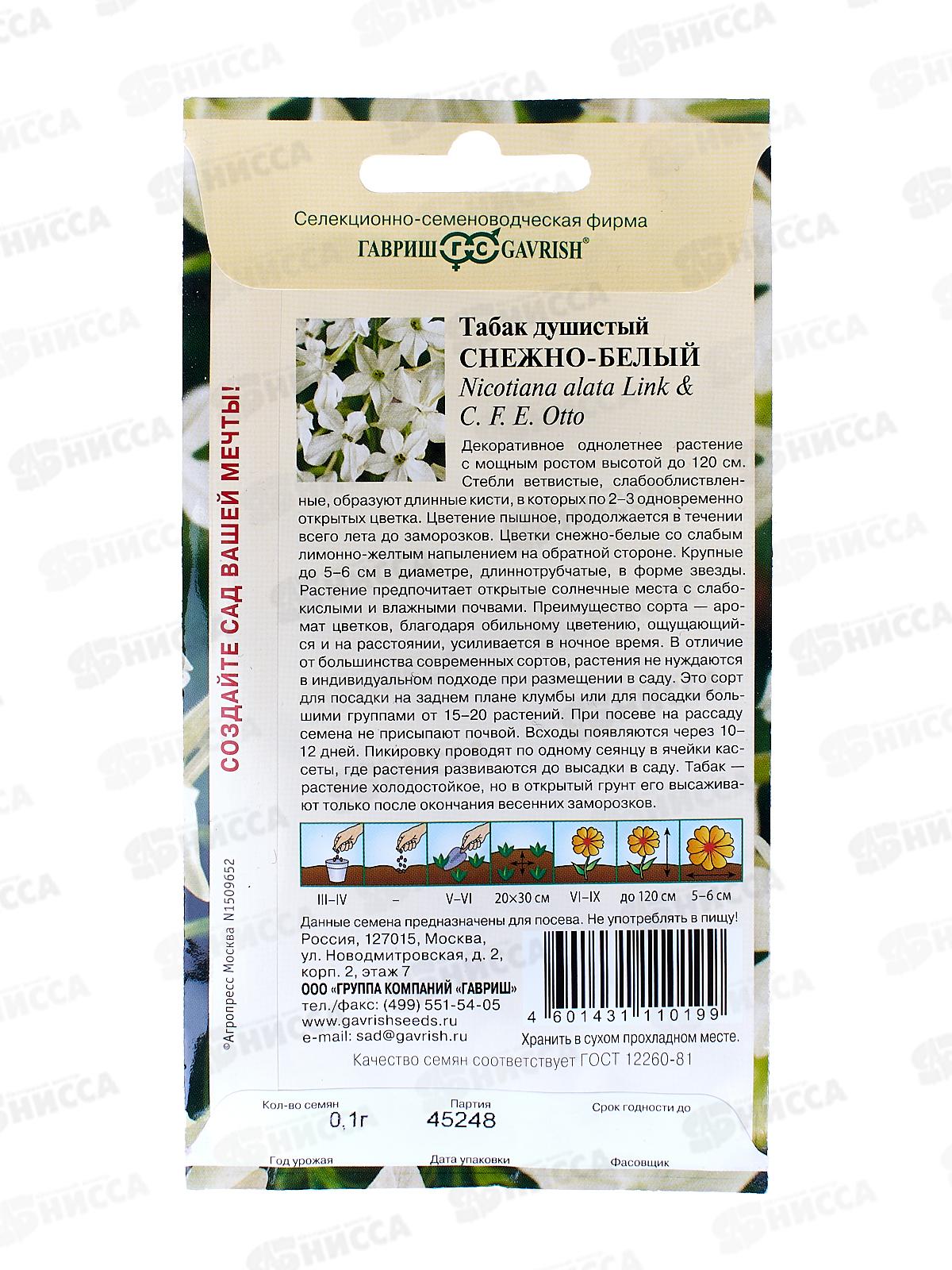Декоративное однолетнее растение с мощным ростом высотой до 120 см. Стебли ветвистые, слабооблиствленные, образуют длинные кисти, в которых по 2-3 одновременно открытых цветка. Цветение пышное, продолжается в течении всего лета до заморозков. Цветки снежно-белые со слабым лимонно-желтым напылением на обратной стороне, крупные до 5-6 см в диаметре, длиннотрубчатые, в форме звезды. Растение предпочитает открытые солнечные места с слабокислыми и влажными почвами. Преимущество сорта — аромат цветков, благодаря обильному цветению, ощущающийся и на расстоянии, усиливается в ночное время. В отличие от большинства современных сортов, растения не нуждаются в индивидуальном подходе при размещении в саду. Это сорт для посадки на заднем плане клумбы или для посадки большими группами от 15-20 растений. При посеве на рассаду семена не присыпают почвой. Всходы появляются через 10-12 дней. Пикировку проводят по одному сеянцу в ячейки кассеты, где растения развиваются до высадки в саду Табак — растение холодостойкое, но в открытый грунт его высаживают только после окончания весенних заморозков.