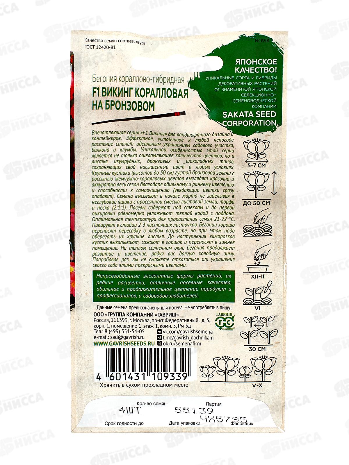 Бегония Викинг коралловая на бронзовом F1 гранул 4шт пробир *5 ГШ +