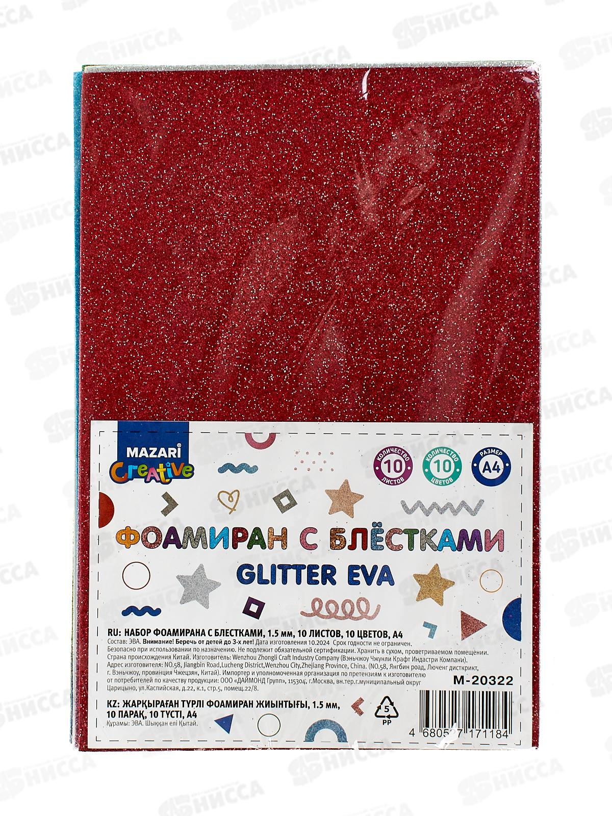 Набор цветного фоамирана 10л 10цв А4 с блестками Mazari M-20322
