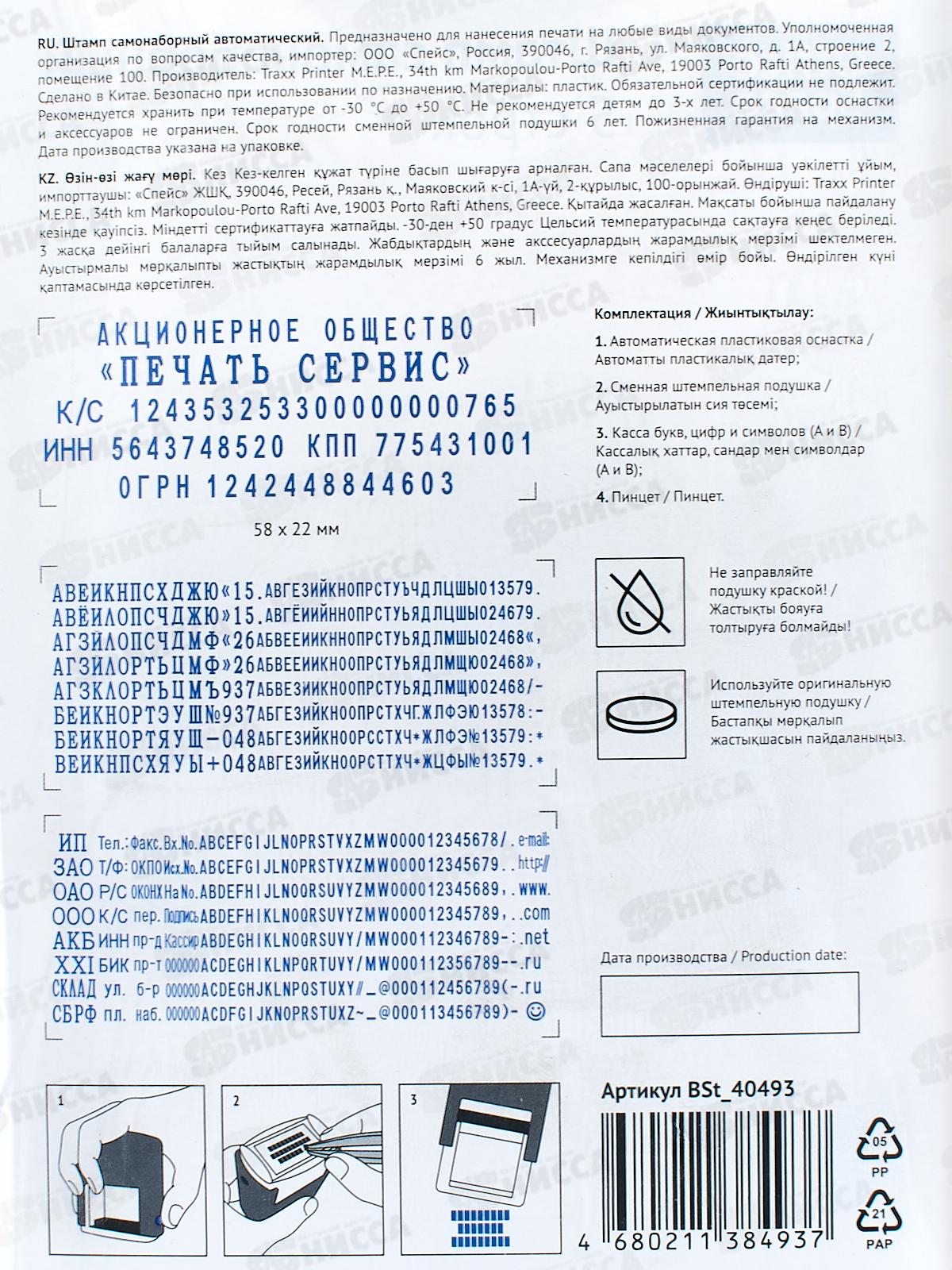 Комплектация: касса шрифта, пинцет, сменная подушка