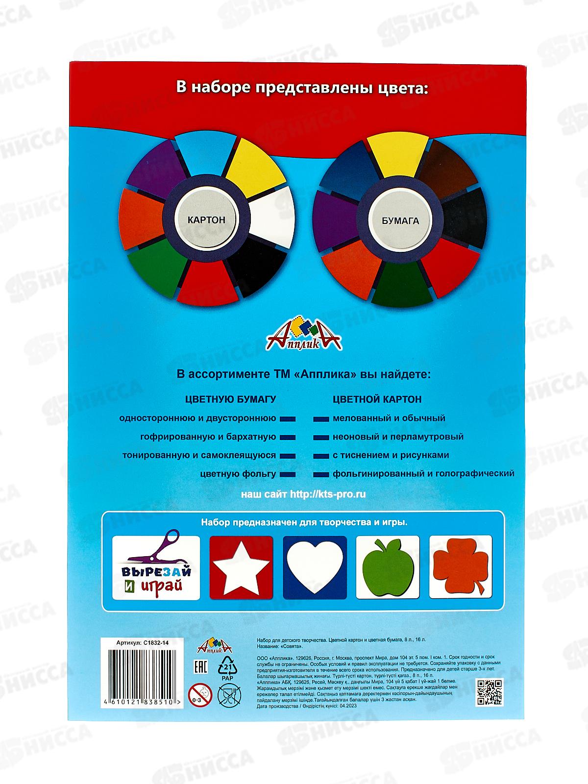Набор цветного картона 8 листов, 8 цветов и цветной бумаги 16 листов, 8 цветов. Формат А4. Внутренний блок изготовлен из немелованного картона, плотность 200 гр/м2 и офсетной №2 бумаги. В наборе цвета картона: красный, синий, зеленый, желтый, оранжевый, фиолетовый, черный, белый, бумага: синий, желтый, красный, черный, розовый, оранжевый, коричневый, зеленый. Упаковка - папка выполнена из мелованного картона.