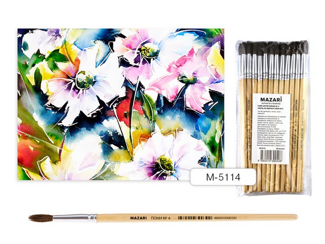 Кисть №4 от торговой марки Mazari М-5114. Кисти из Вид ворсаа пони надежные, долговечные, гипоаллергенные. идеально подойдут для работы с акварелью, гуашью, акрилом, клеем. В основном используются детьми дошкольного возраста и учениками начальных классов. Компания позаботилась о создании главного инструмента для маленького художника. Рисование развивает умственные способности, зрительное и пространственное восприятие, а также мелкую моторику рук. Поставляется без упаковки.