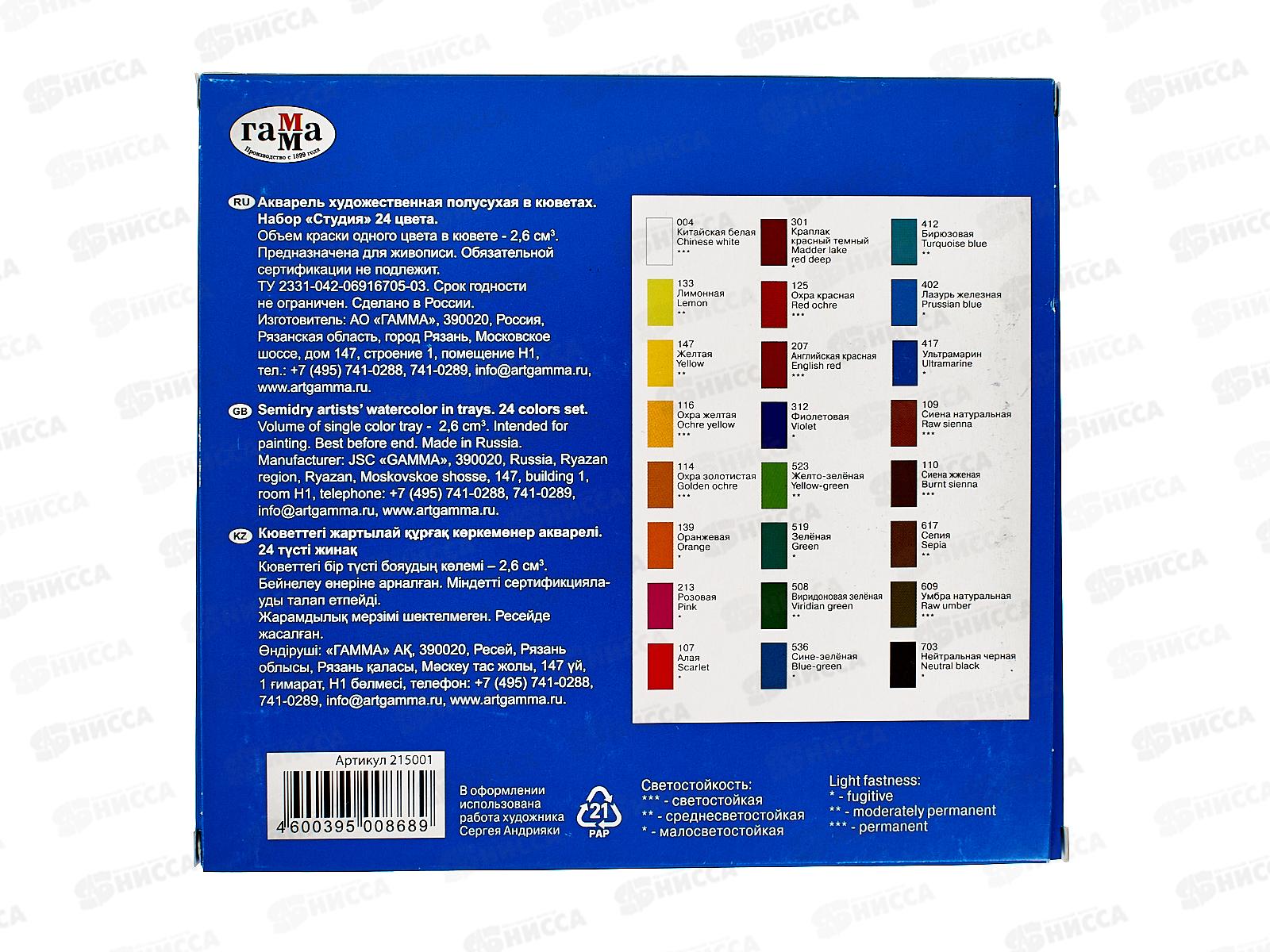 Акварель художественная .24 цвета ГАММА Студия, кюветы, 215001 *14
