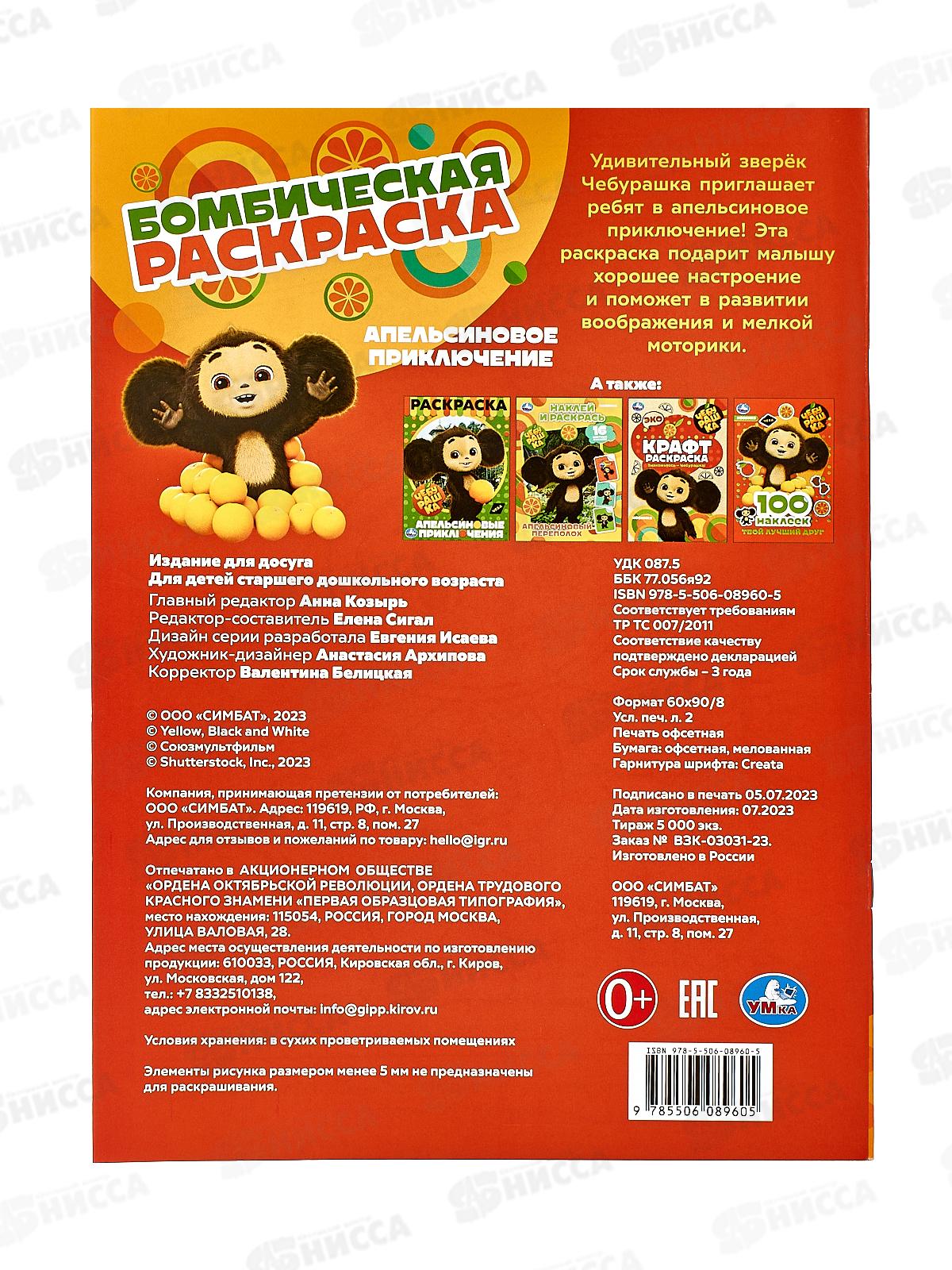 Раскраска "УМКА" 08960-5, Бомбическая. Чебурашка. Апельсиновое приключение 16стр.*50