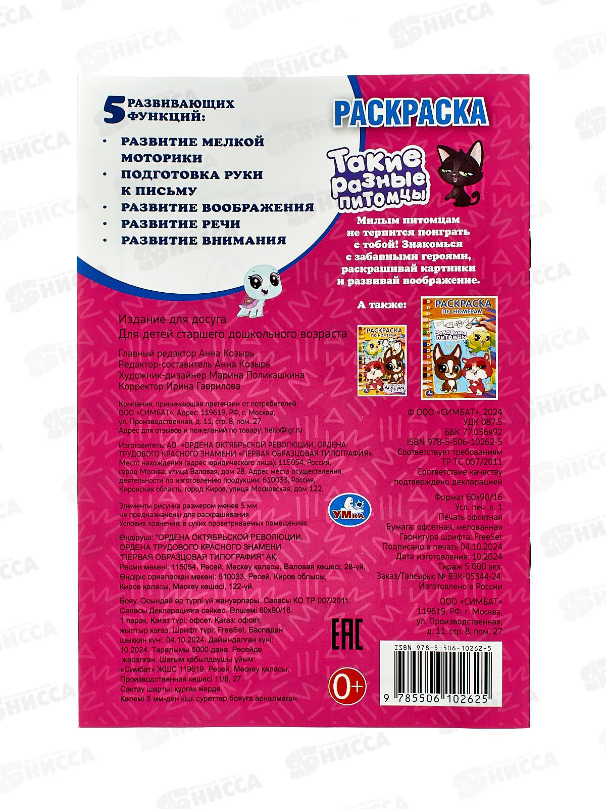 Раскраска "УМКА" 10262-5, Такие разные питомцы. 145х210мм 16стр. *50