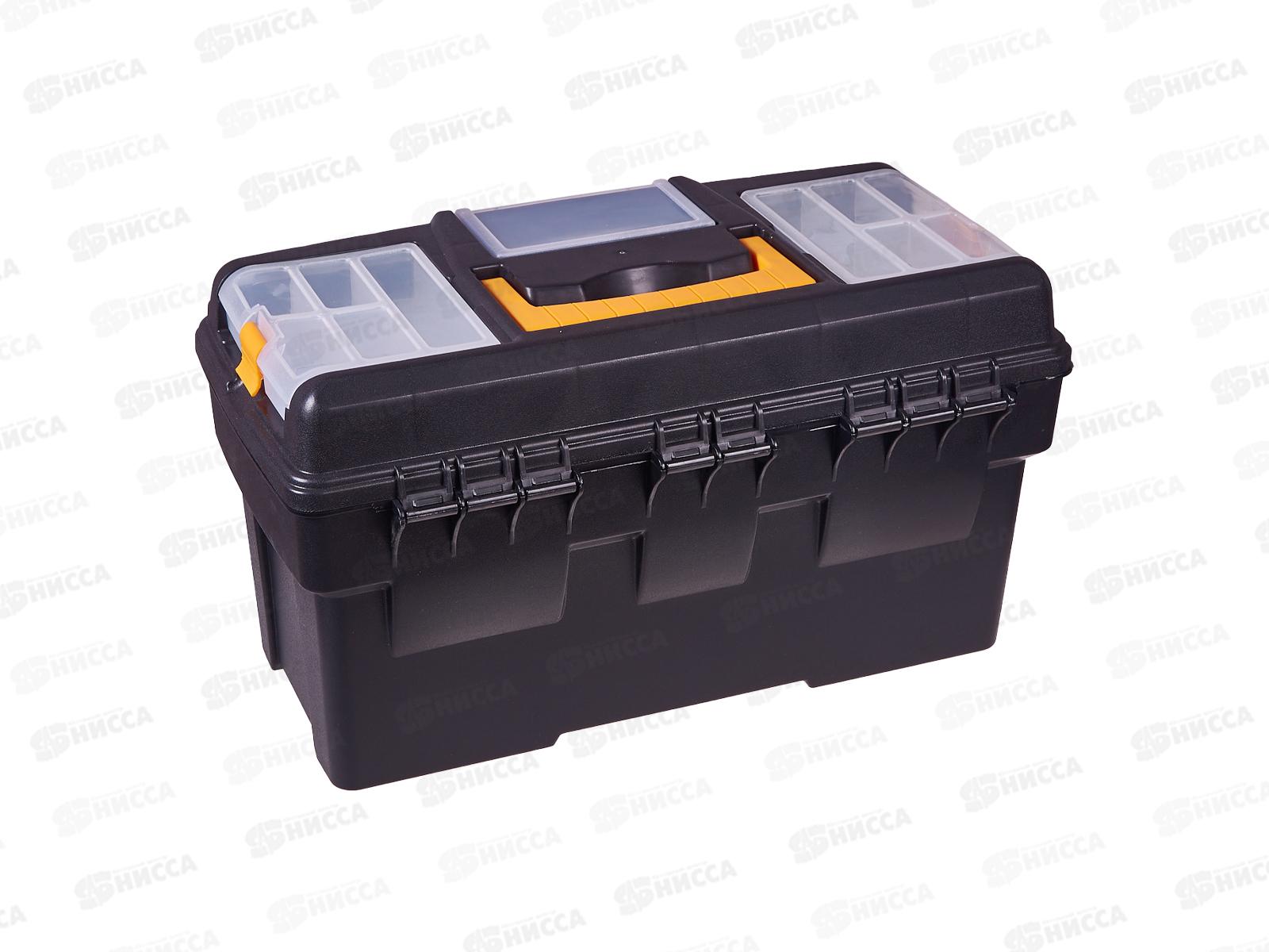 Ящик для инструментов используется для хранения и транспортировки ручного инструмента. На крышке расположены 3 практичных органайзера для хранения мелочей. В ящике предусмотрен вкладыш для инструментов с внутренними перегородками, вместительное главное отделение позволяет организовать хранение множества инструментов. При изготовлении используется прочный пластик, обеспечивающий длительный срок эксплуатации. Застежки выполнены из металла.