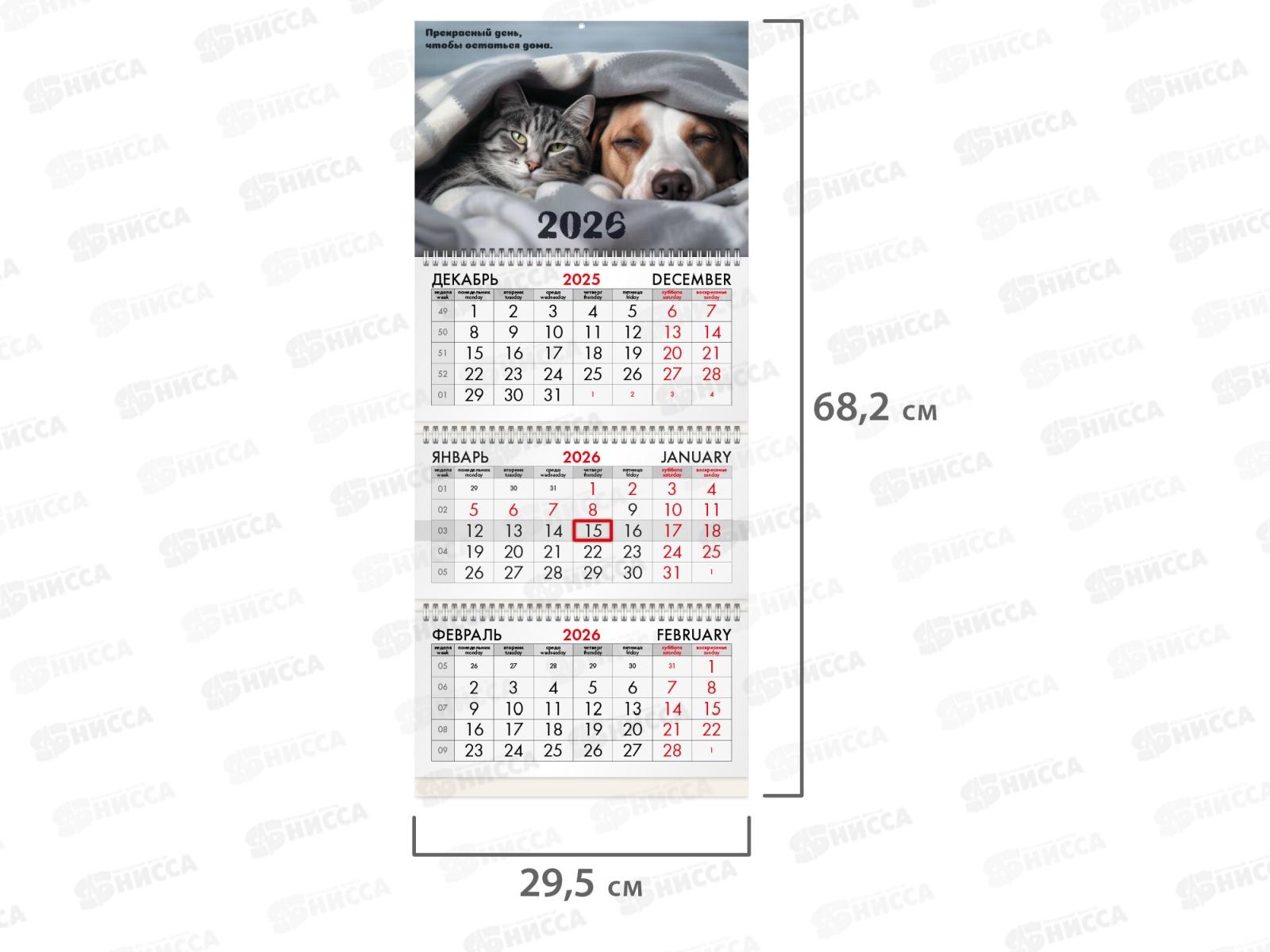Офисный календарь на 2026 год на 3 гребнях. Состоит из 3 блоков с календарными сетками на три месяца – предыдущий, текущий и последующий. Курсор-бегунок выделяет текущую дату. Вертикальный формат.