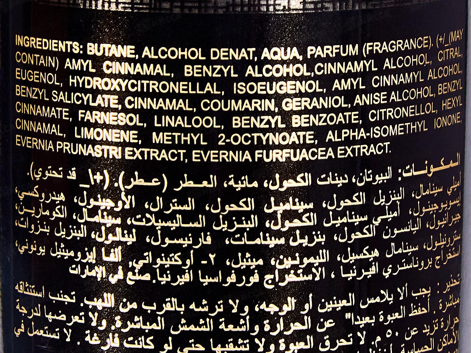 Состав: Бутан, Денатурат спирта (38,16%),Парфюмированная вода, Вода, Пропиленгликоль,Кумарин,Лимонен,Циннамиловый спирт,Циннамал,Заявленные аллергены на парфюмерию - >0,001%.