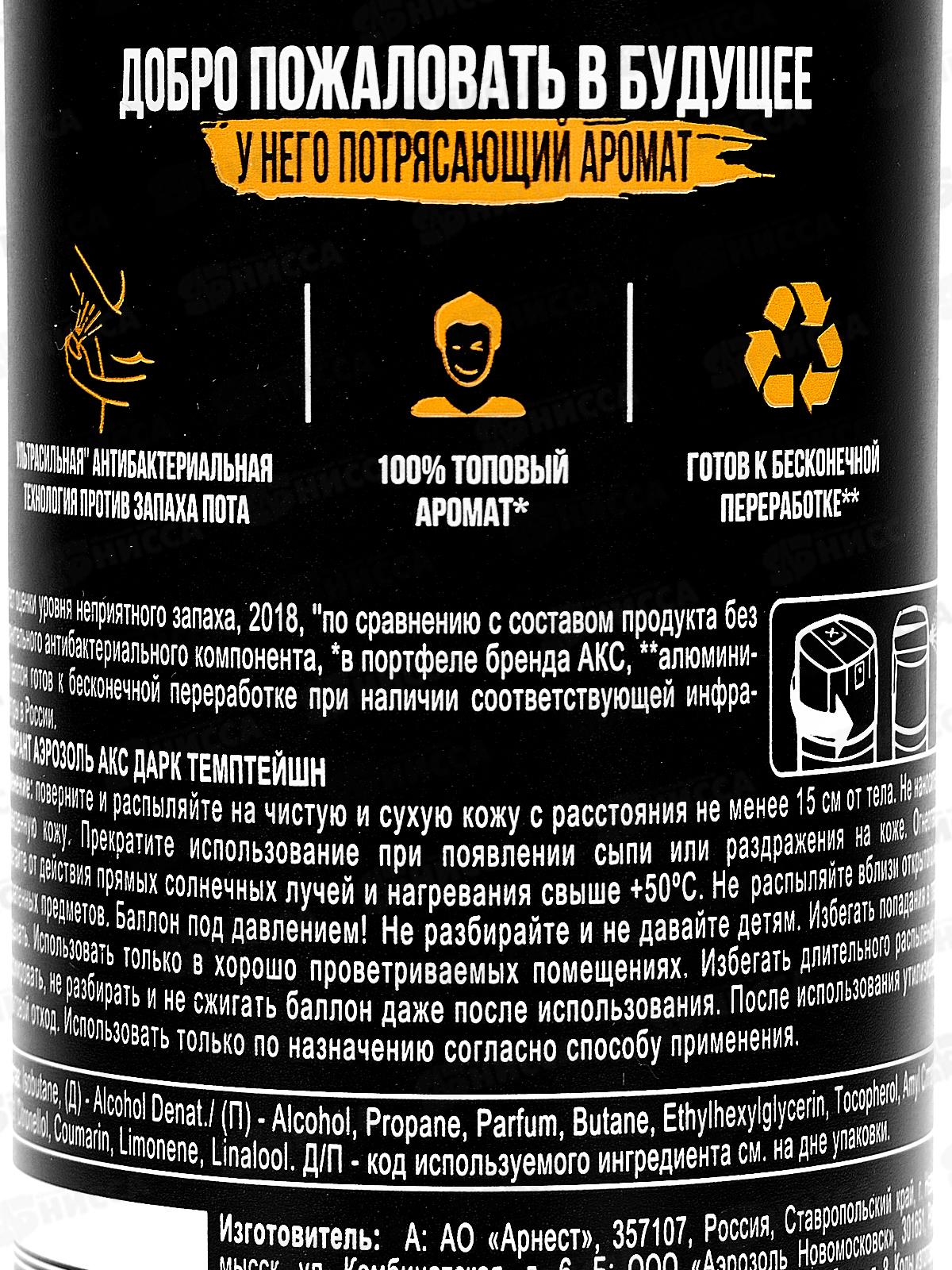 Дезодорант-аэрозоль «АКС DARK TEMPTATION» c чувственным, волнующим ароматом со сладкими оттенками белого, молочного и горького шоколада бергамота эффективно и без лишних усилий дезодорирует кожу и обеспечивает её антибактериальную защиту.