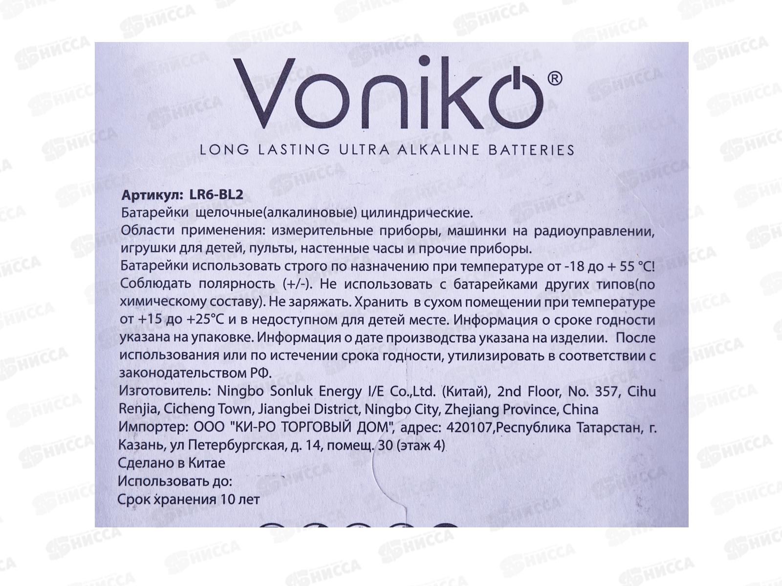 Батарейка VONIKO алкалиновая LR6 АА, 2шт на блистере *2/40/320