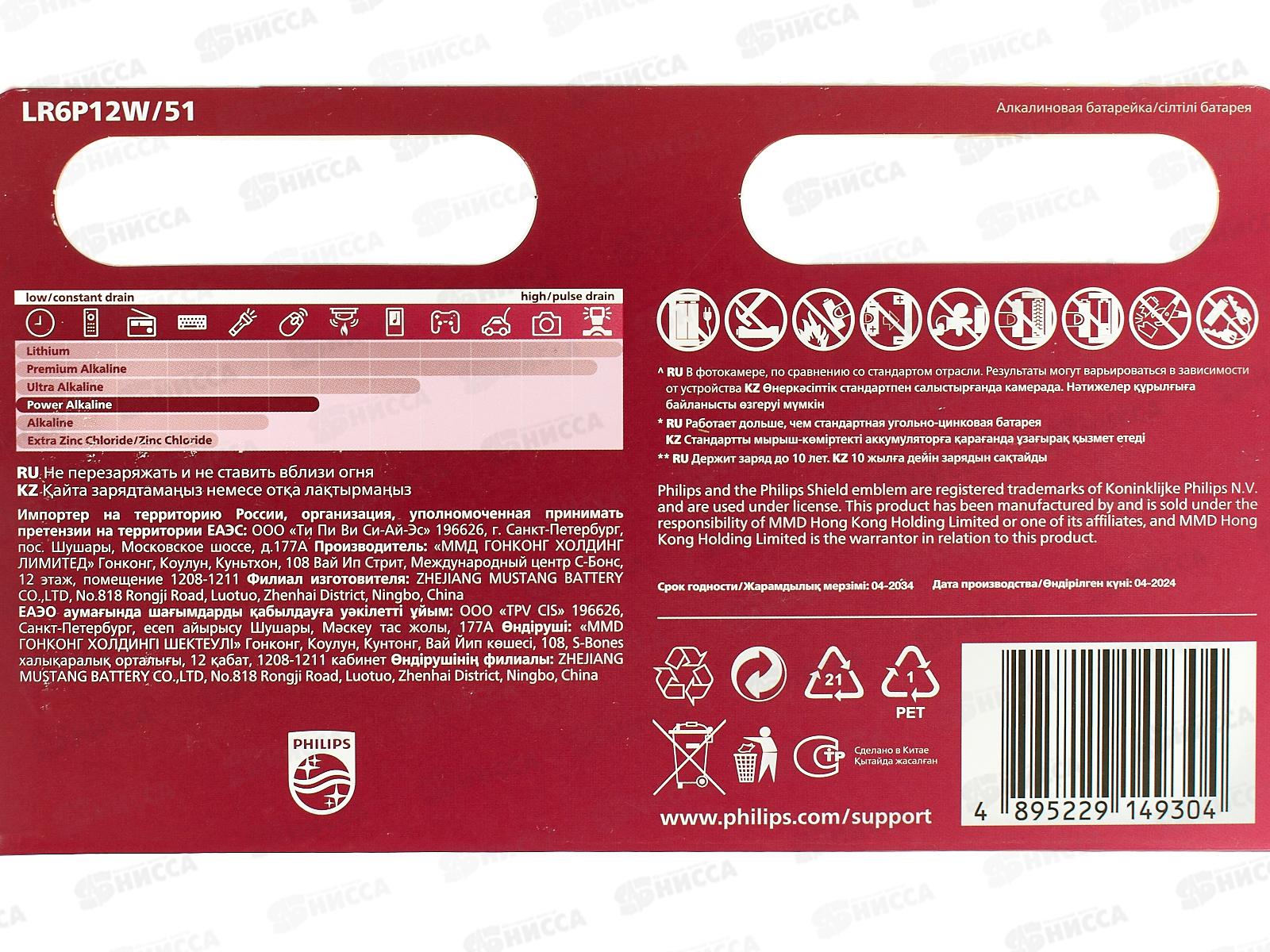 Батарейка ФИЛИПС LR6 Power Alkaline 12BL *12/240