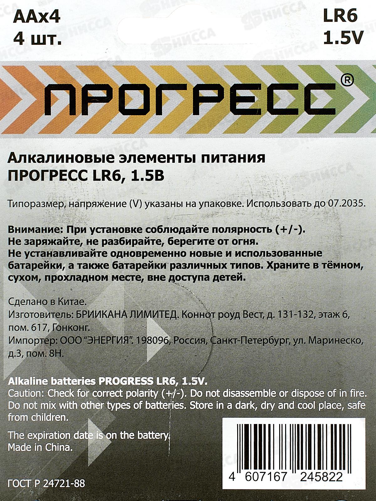 Батарейка ПРОГРЕСС LR6 card *4/48/768