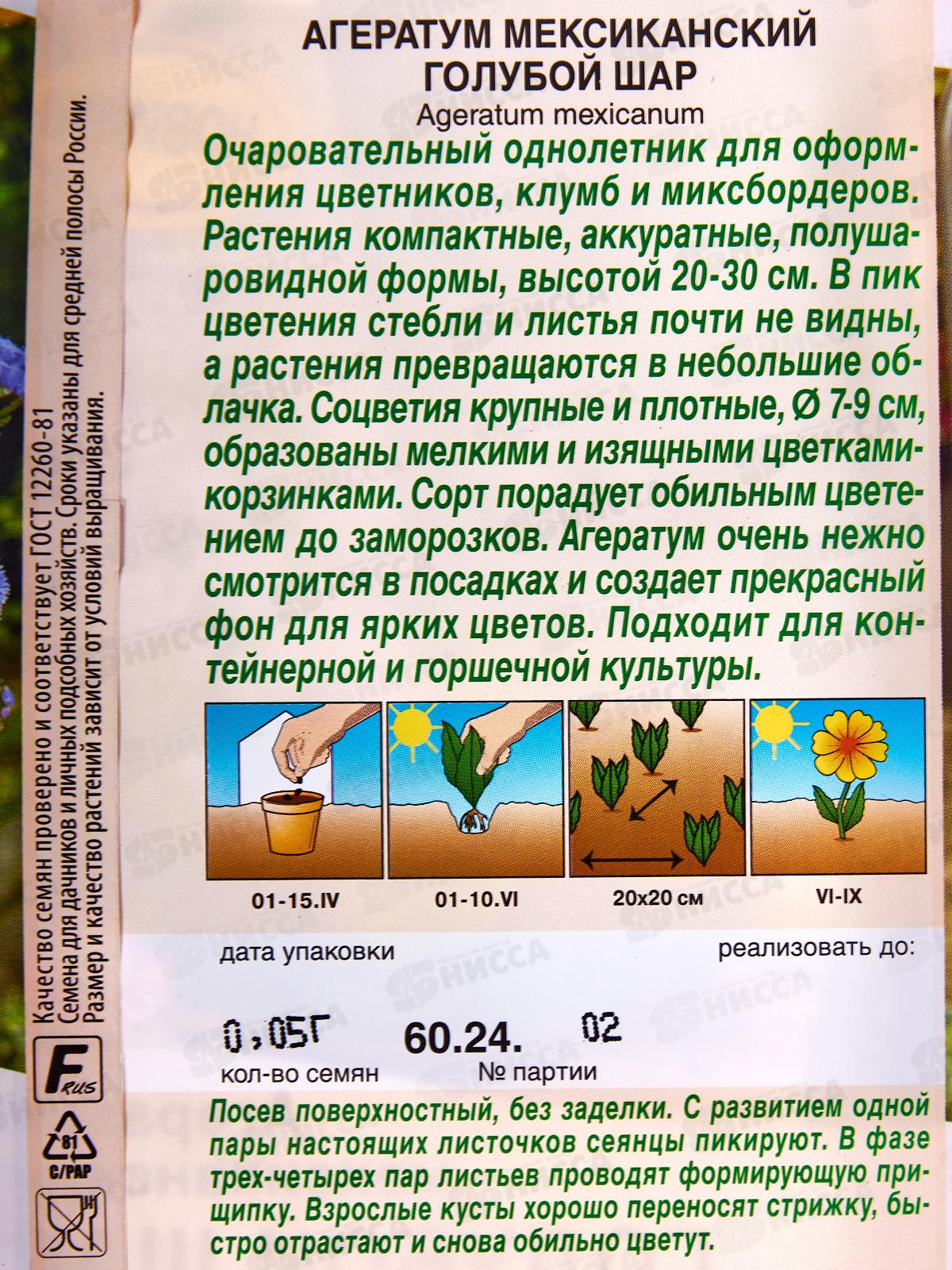 Растения компактные, аккуратные, полушаровидной формы, высотой 20-30 см. В пик цветения стебли и листья почти не видны, а растения превращаются в небольшие облачка. Соцветия крупные и плотные, диаметром 7-9 см, образованы мелкими и изящными цветками-корзинками. Сорт порадует обильным цветением до заморозков. Агератум очень нежно смотрится в посадках и создает прекрасный фон для ярких цветов. Подходит для контейнерной и горшечной культуры. Посев поверхностный, без заделки. С развитием одной пары настоящих листочков сеянцы пикируют. В фазе 3-4 пар листьев проводят формирующую прищипку. Взрослые кусты хорошо переносят стрижку, быстро отрастают и снова обильно цветут.