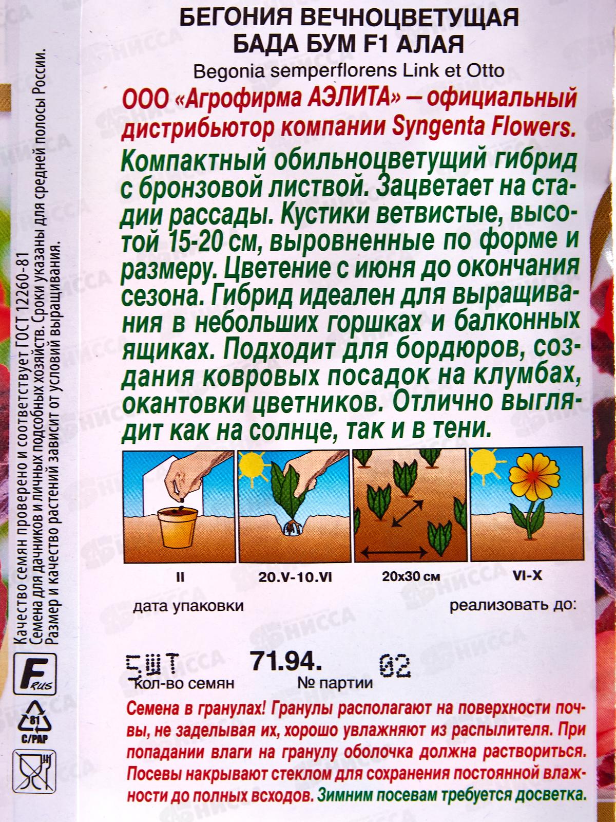 Компактный обильноцветущий гибрид с бронзовой листвой. Зацветает на стадии рассады. Кустики ветвистые, высотой 15-20 см, выровненные по форме и размеру. Цветение с июня до окончания сезона. Гибрид идеален для выращивания в небольших горшках и балконных ящиках. Подходит для бордюров, создания ковровых посадок на клумбах, окантовки цветников. Отлично выглядит как на солнце, так и в тени. Семена в гранулах! Гранулы располагают на поверхности почвы, не заделывая их, хорошо увлажняют из распылителя. При попадании влаги на гранулу оболочка должна раствориться. Посевы накрывают стеклом для сохранения постоянной влажности до полных всходов. Зимним посевам требуется досветка.