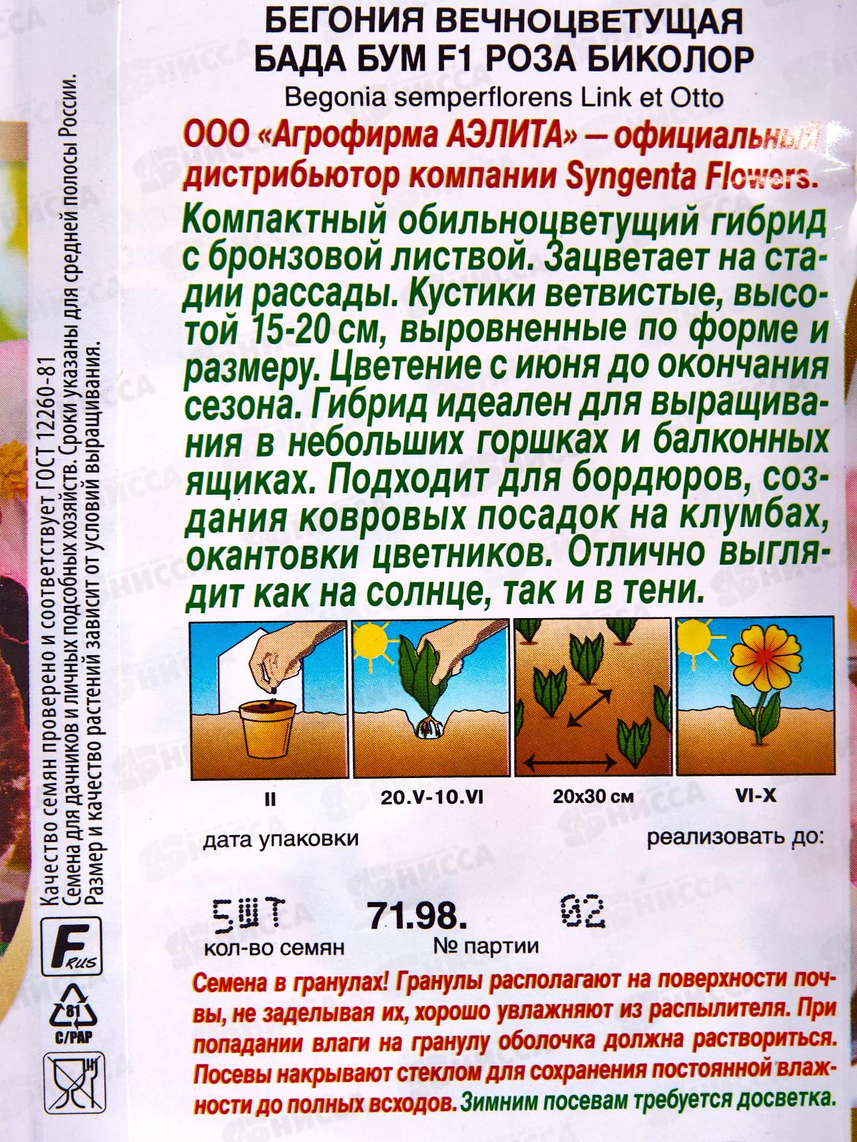 Компактный обильноцветущий гибрид с бронзовой листвой. Зацветает на стадии рассады. Кустики ветвистые, высотой 15-20 см, выровненные по форме и размеру. Цветение с июня до окончания сезона. Гибрид идеален для выращивания в небольших горшках и балконных ящиках. Подходит для бордюров, создания ковровых посадок на клумбах, окантовки цветников. Отлично выглядит как на солнце, так и в тени. Семена в гранулах! Гранулы располагают на поверхности почвы, не заделывая их, хорошо увлажняют из распылителя. При попадании влаги на гранулу оболочка должна раствориться. Посевы накрывают стеклом для сохранения постоянной влажности до полных всходов. Зимним посевам требуется досветка.