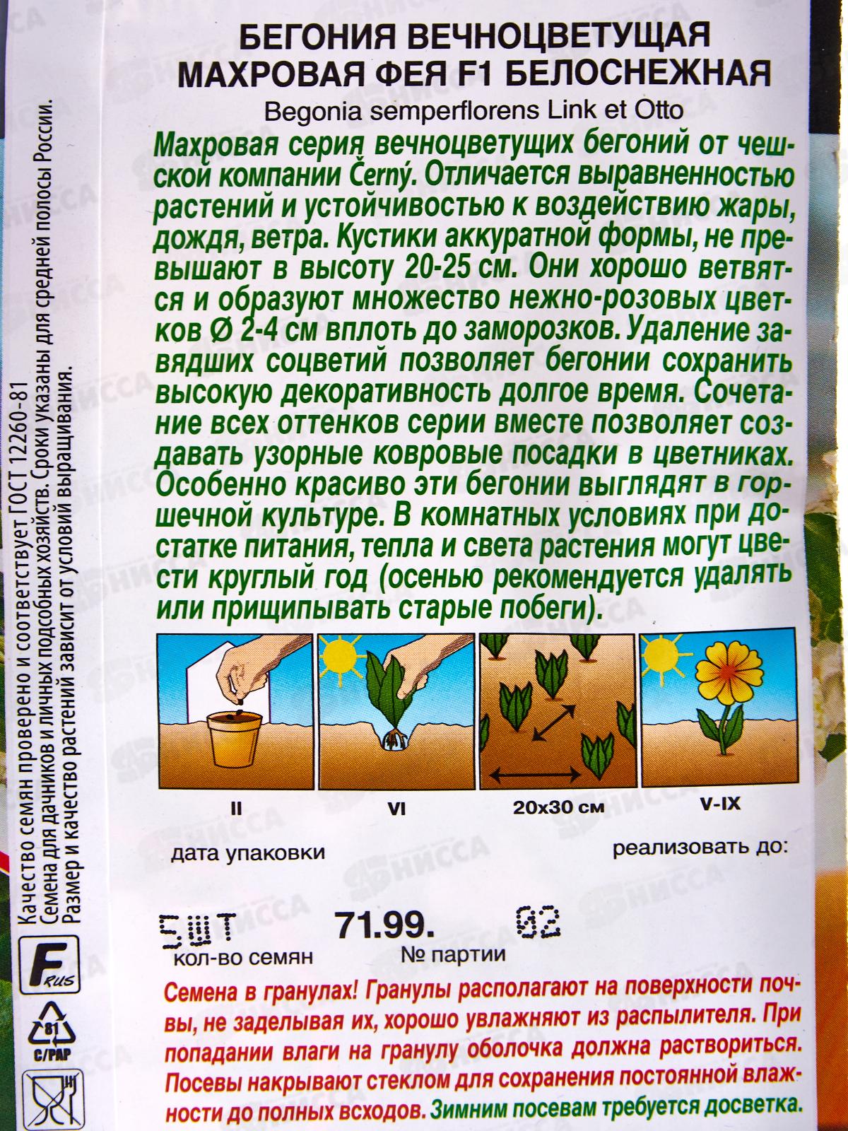 Отличается выравненностью растений и устойчивостью к воздействию жары, дождя, ветра. Кустики аккуратной формы, не превышают в высоту 20-25 см. Они хорошо ветвятся и образуют множество белоснежных цветков диаметром 2-4 см вплоть до заморозков. При соблюдении схемы посадки гибриды способны самоочищаться от завядших цветков, что облегчает уход. Сочетание всех оттенков серии вместе позволяет создавать узорные ковровые посадки в цветниках. Особенно красиво эти бегонии выглядят в горшечной культуре. В комнатных условиях при хорошей агротехнике они могут цвести круглый год (осенью рекомендуется удалять или прищипывать старые побеги). Семена в гранулах! Гранулы располагают на поверхности почвы, не заделывая их, хорошо увлажняют из распылителя. При попадании влаги на гранулу оболочка должна раствориться. Посевы накрывают стеклом для сохранения постоянной влажности до полных всходов. Зимним посевам требуется досветка.