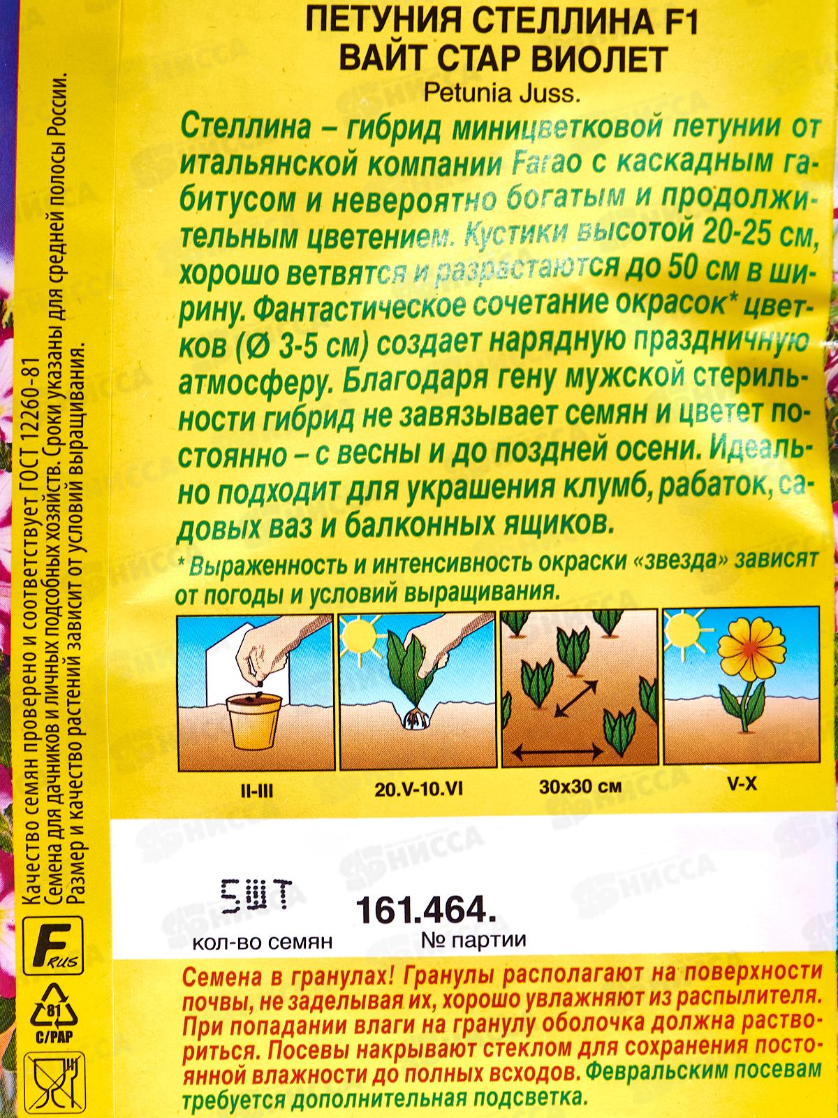 Кустики высотой 20-25 см,хорошо ветвятся и разрастаются до 50 см в ширину. Фантастическое сочетание окрасок цветков (3-5 см) создает нарядную праздничную атмосферу. Благодаря гену мужской стерильности гибрид не завязывает семян и цветет постоянно – с весны и до поздней осени. Идеально подходит для украшения клумб, рабаток, садовых ваз и балконных ящиков. Выраженность и интенсивность окраски «звезда» зависят от погоды и условий выращивания. Семена в гранулах! Гранулы располагают на поверхности почвы, не заделывая их, хорошо увлажняют из распылителя. При попадании влаги на гранулу оболочка должна раствориться. Посевы накрывают стеклом для сохранения постоянной влажности до полных всходов. Февральским посевам требуется дополнительная подсветка.