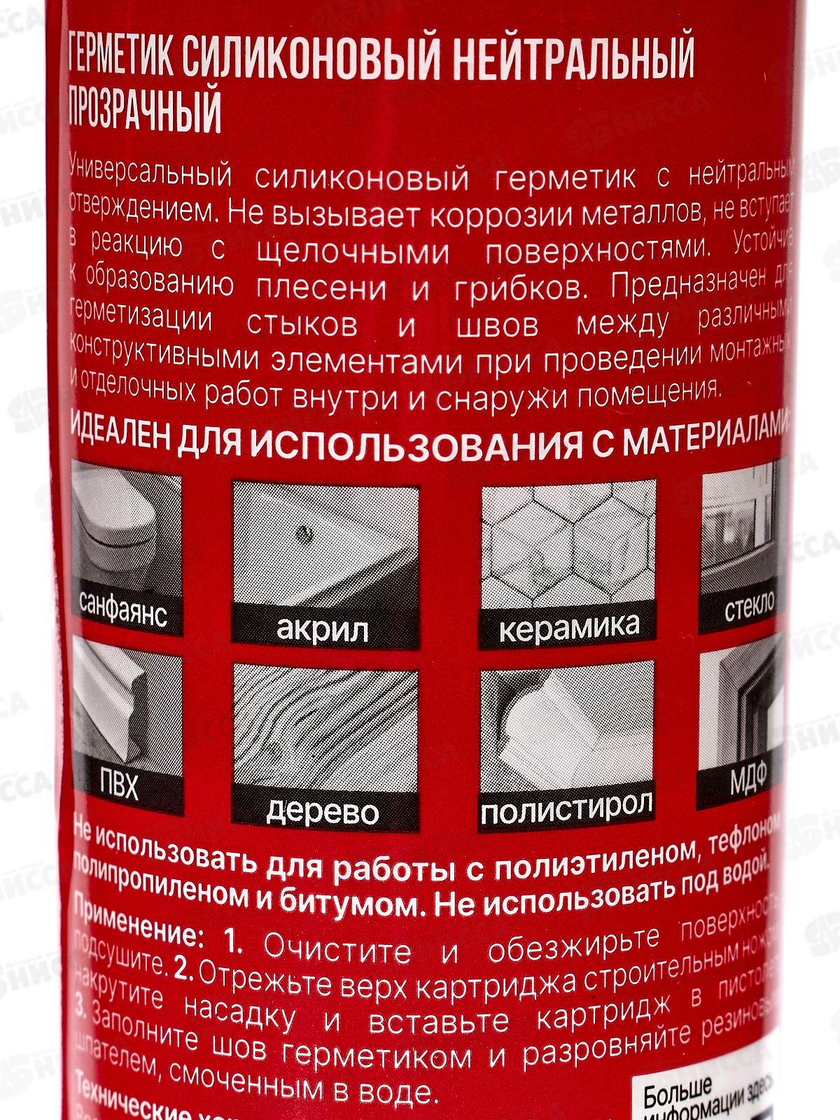 Универсальный силиконовый герметик с нейтральным отверждением. Не вызывает коррозии металлов, не вступает в реакцию с щелочными поверхностями, устойчив к образованию плесени и грибков. Предназначен для герметизации стыков и швов между различными конструктивными элементами при проведении монтажных и отделочных работ внутри и снаружи помещения. Не использовать для работы с полиэтиленом, полипропиленом, тефлоном, битумом и поверхностями постоянно подвергающихся воздействию воды.