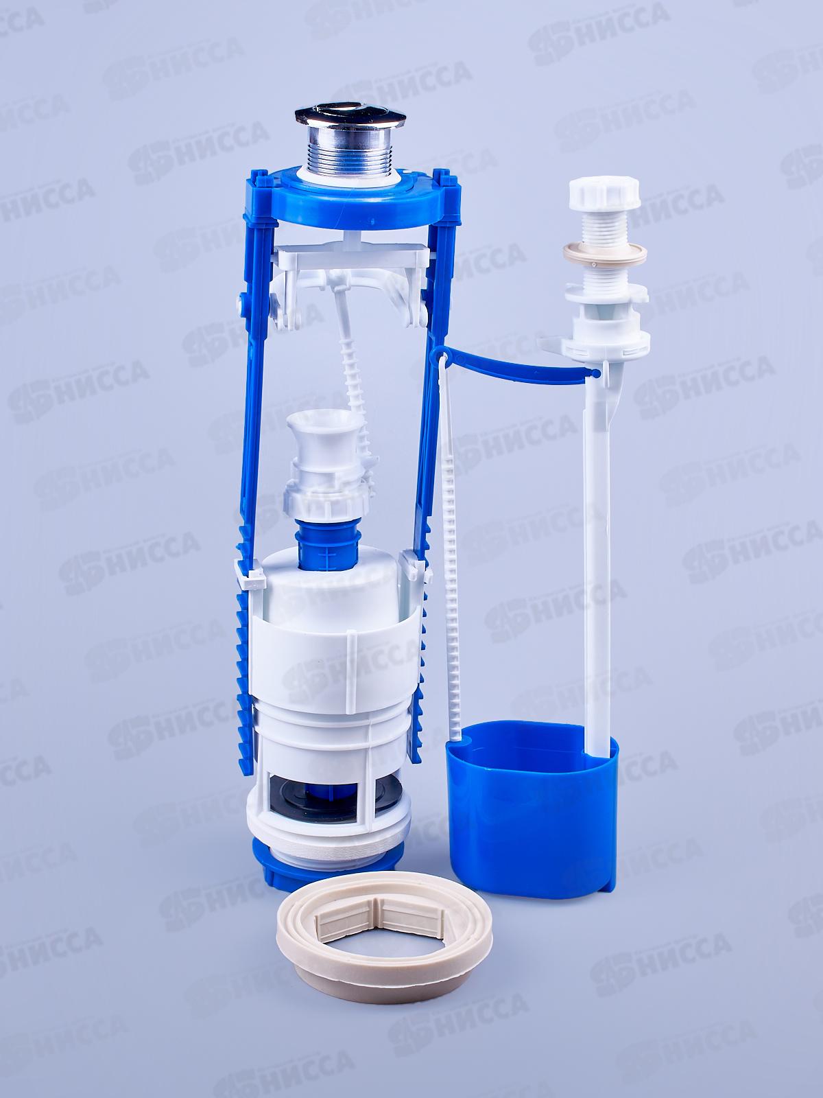 Арматура АС-12.1М кнопочная 2-х уровневая с клапаном АН-01 нижней подводки воды. Данная арматура качественно отличается от штоковых арматур, при этом она включает в себя лучшие их качества. Арматура универсальная: устанавливается и в "средние" бачки (высота до крышки бачка от 310 мм до 390 мм), и "высокие" (высота до крышки бачка 420 мм). В данной модели используется наполнительная арматура нижней подводки, прямого действия. Запирание происходит путём воздействия поплавка через тягу, водило на ползун мембраны, которая перекрывает подающее отверстие сетевой воды.
