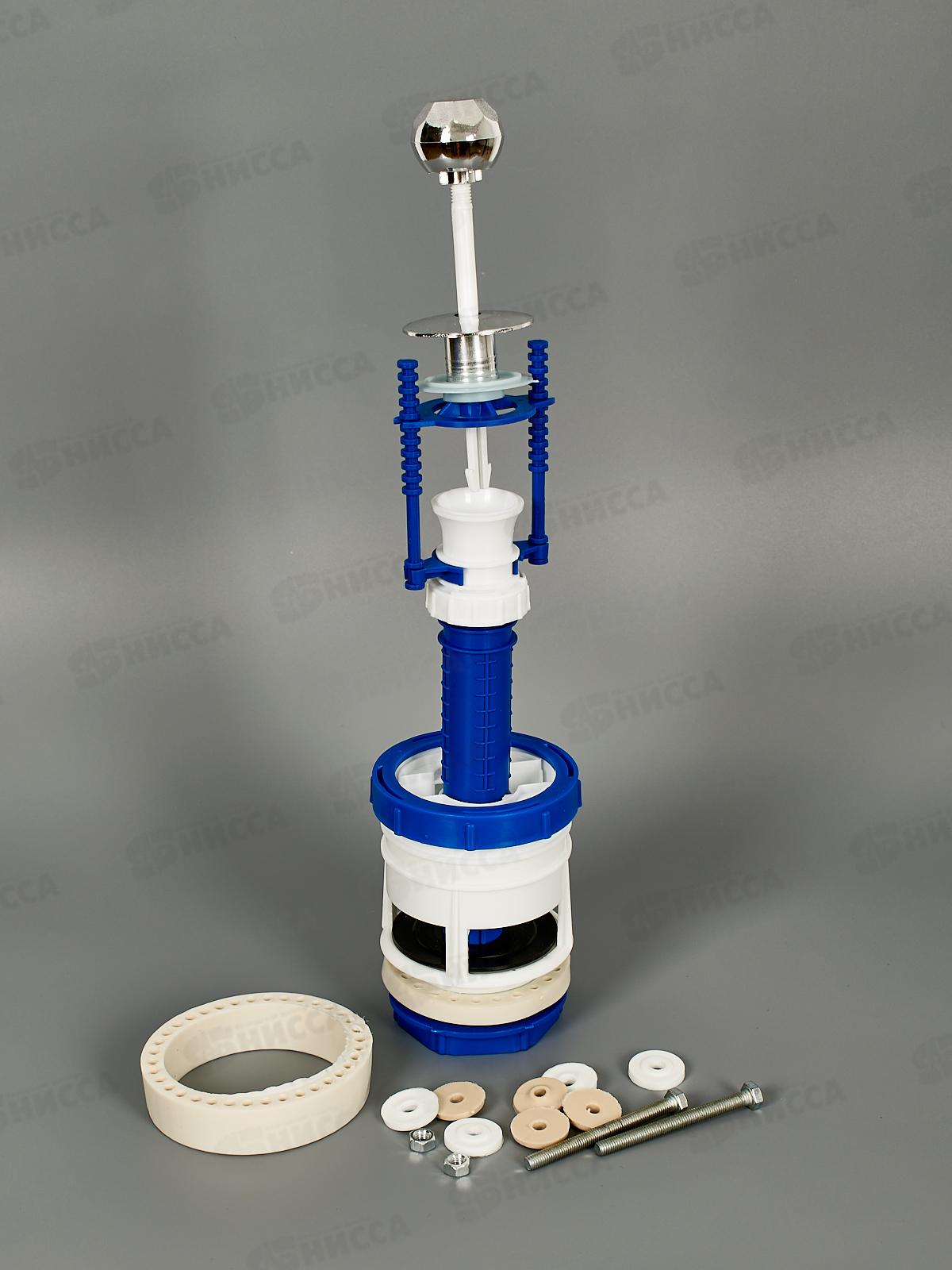 Арматура спускная КВ-5.1М штоковая. Арматура является универсальной: может устанавливаться и в «низкие» бачки (высота до крышки бачка 270-280 мм), «средние» (высота до крышки бачка до 390 мм), «высокие» (высота до крышки бачка 425 мм), а конструкция втулки позволяет использовать ее как с узким отверстием крышки бачка (24 мм), так и с широким (40 мм). Достоинством данной арматуры, по сравнению с арматурами других производителей, нужно отметить ее конструктивные особенности, обеспечивающие устойчивость к продольному перекосу, это позволяет устанавливать ее в бачки с несовпадением по вертикали отверстия в крышке бачка и смывного отверстия (смывные бачки 2го и 3го сорта). Плоский донный клапан обеспечивает плотное запирание смывного отверстия, исключая просачивание воды в унитаз. Система поплавков обеспечивает фиксированный полный смыв. Конструкция колонки обеспечивает простоту крепления её в бачке, а также установку трубки перелива в нужном положении по высоте. Наличие переливного устройства исключает нежелательный пролив воды из бачка.