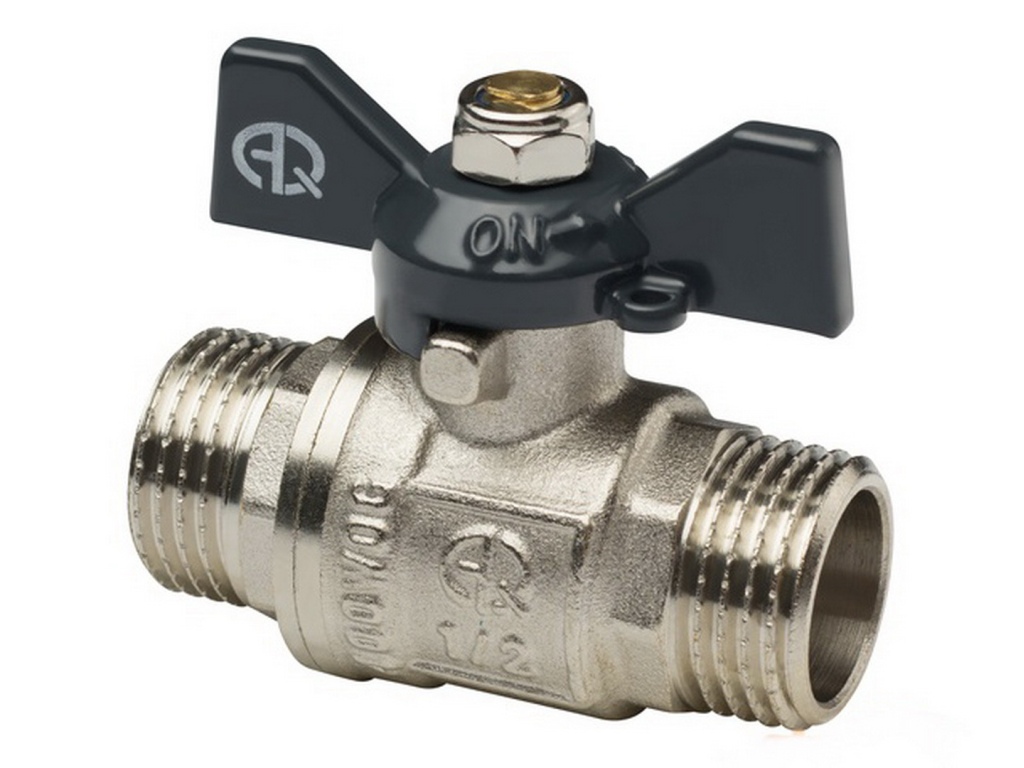 Кран шаровой Aqualink 02336 бабочка с наружной резьбой 1/2 дюйма это запорная арматура высокого качества, обладающая усиленным корпусом из никелированной латуни ЛС59-2 (CW617N) и запорным механизмом с классом герметичности «А».