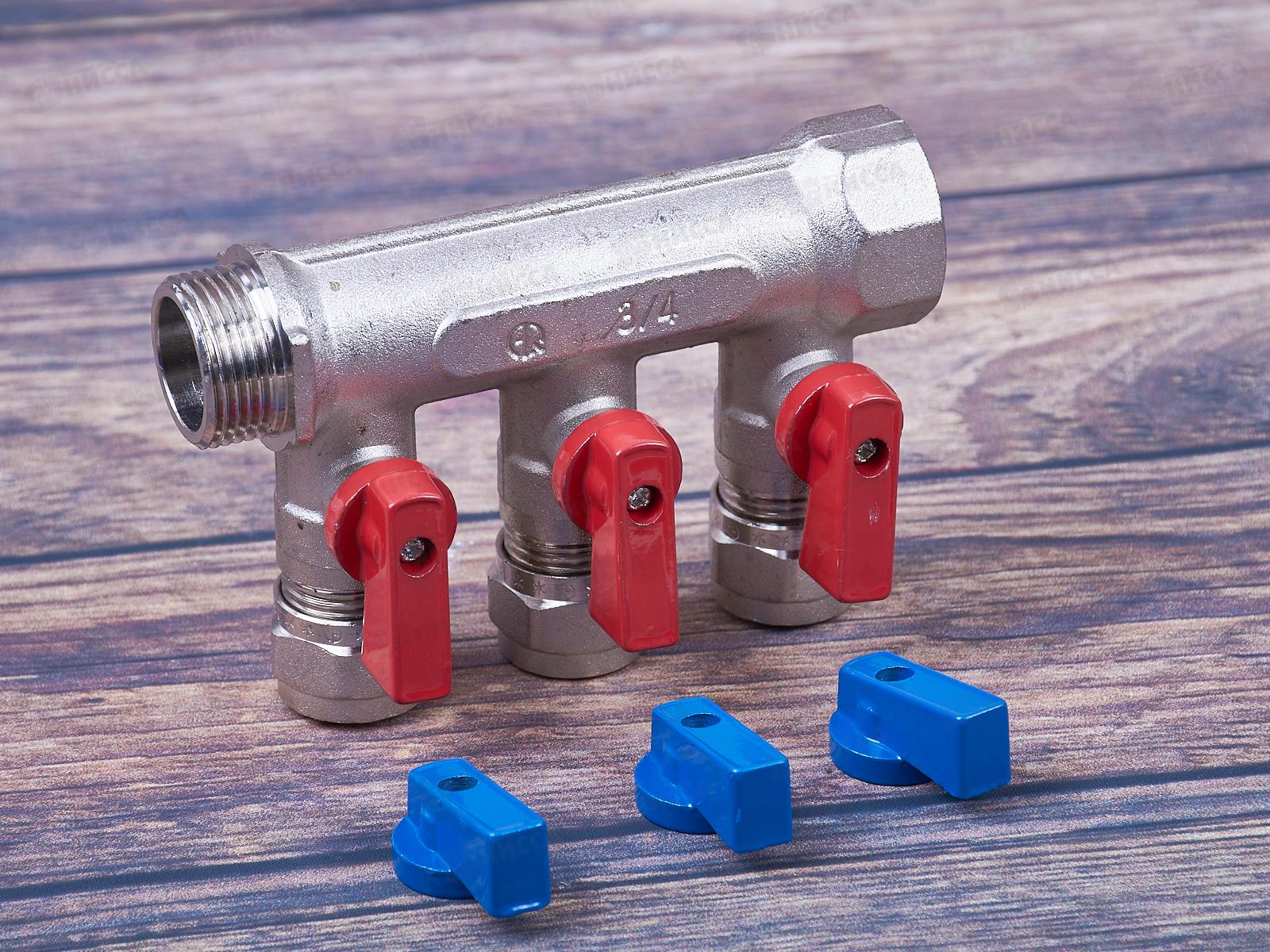 Коллектор Aqualink 03934 3 выхода с шаровыми кранами с внутренней и наружной резьбой 3/4 дюйма 16 мм используется для распределения и регулирования рабочей среды в системах горячего и холодного хозяйственно-питьевого водоснабжения, а также отопления: системы «теплый пол» и радиаторного отопления.