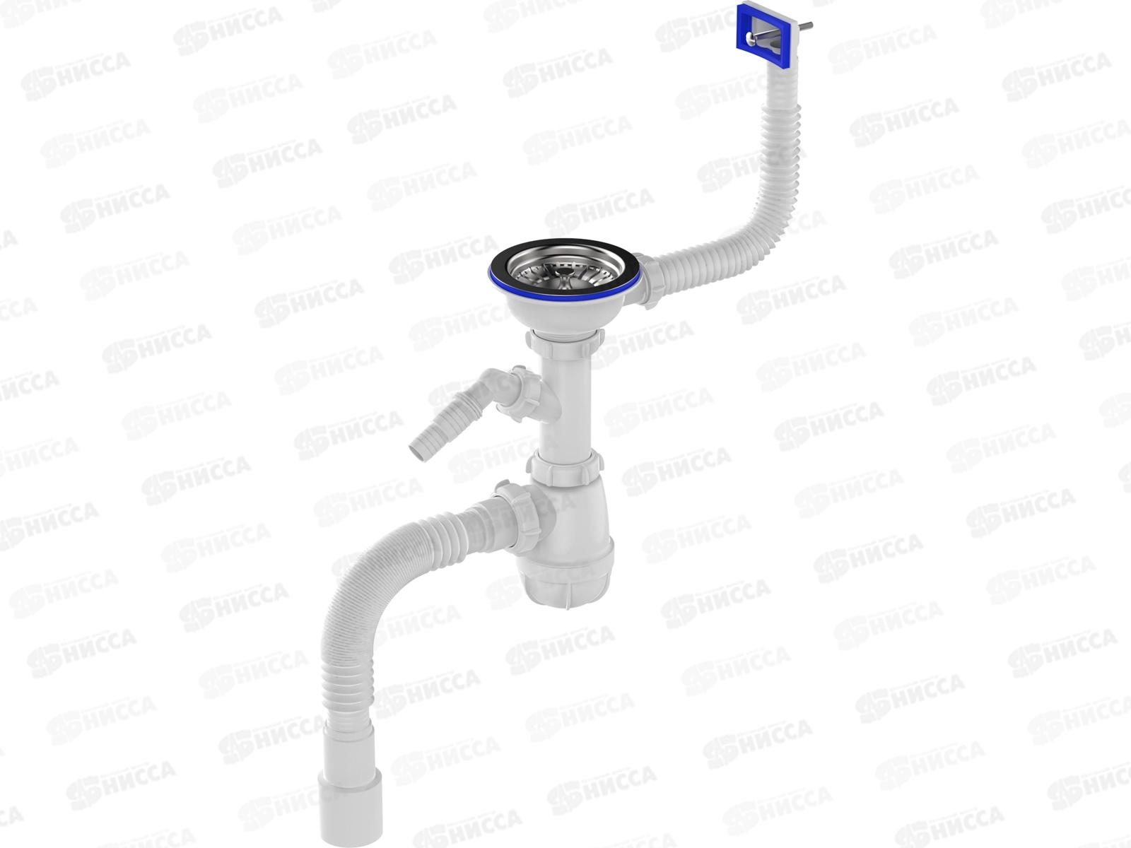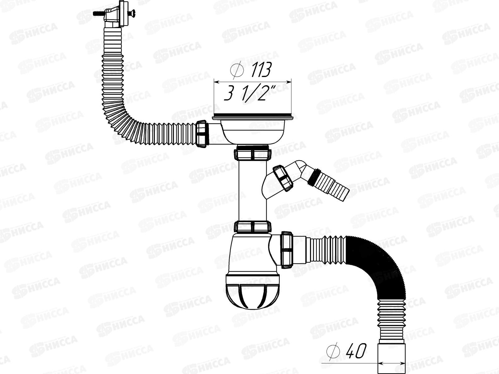 Сифон для мойки 3 1/2" х 40 с металлической решеткой, прямоугольным переливом, с отводом для стиральных машин с гофротрубой 40*40/50, 0147 *20