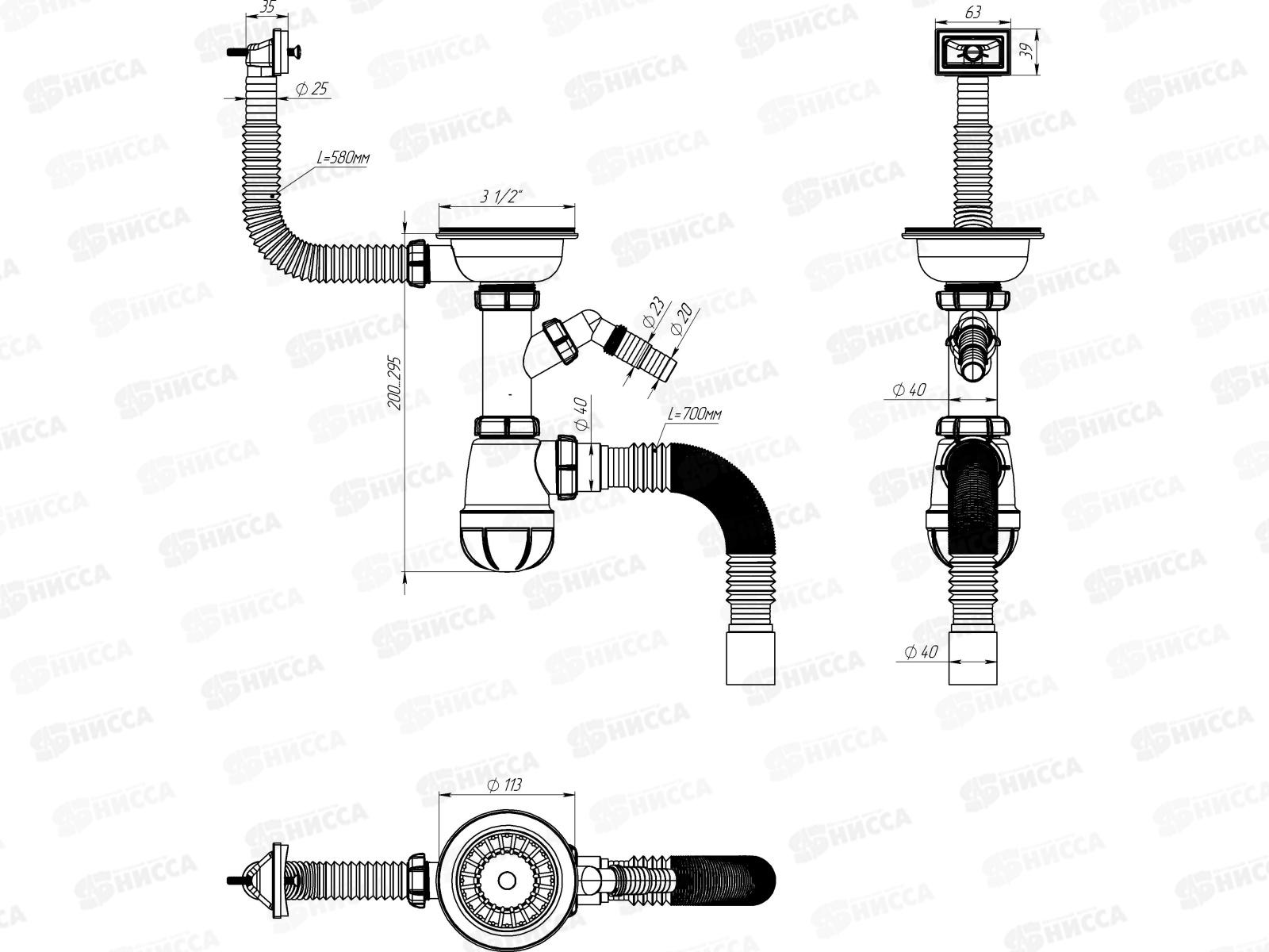 Сифон бутылочного типа от бренда Aquant, подходит для кухонных моек с диаметром сливного отверстия 90 мм. Выпуск 3 1/2" - разборный, с металлическими решетками 113 мм и ситечком 78 мм в комплекте с трубкой и прямоугольным переливом с двумя видами прокладок, под прямую и круглую мойки. Корпус сифона увеличенный, для достижения максимальной проточности и поддержания оптимального уровня гидрозатвора с высотой 55мм. Идет в комплекте с специальным патрубком с отводом для подключения стиральной машины и гофротрубой с универсальным выходом под два диаметра 40/50мм для подключения к канализации. Сифон прост в установке, позволяет прочистить его в случае засорения без демонтажа и способен улавливать мелкие предметы, например, кольца или серьги. Конструкция корпуса сифона Аквант имеет эксклюзивный дизайн и запатентована патентом на промышленный образец. Внутренняя поверхность стакана сифона с зеркальной полировкой обеспечивает улучшенную проточность. Все пластиковые детали сифона производятся из первичного полипропилена с добавлением снежно-белого красителя. Прокладки изготовлены из высококачественных пластикатов (TPE, PVC, LDPE) и обеспечивают длительный срок службы и высокую ремонтопригодность. Сифон выдерживает перепад температур от +5 до +80 градусов. Все необходимые прокладки, гайки и винты в комплекте.
