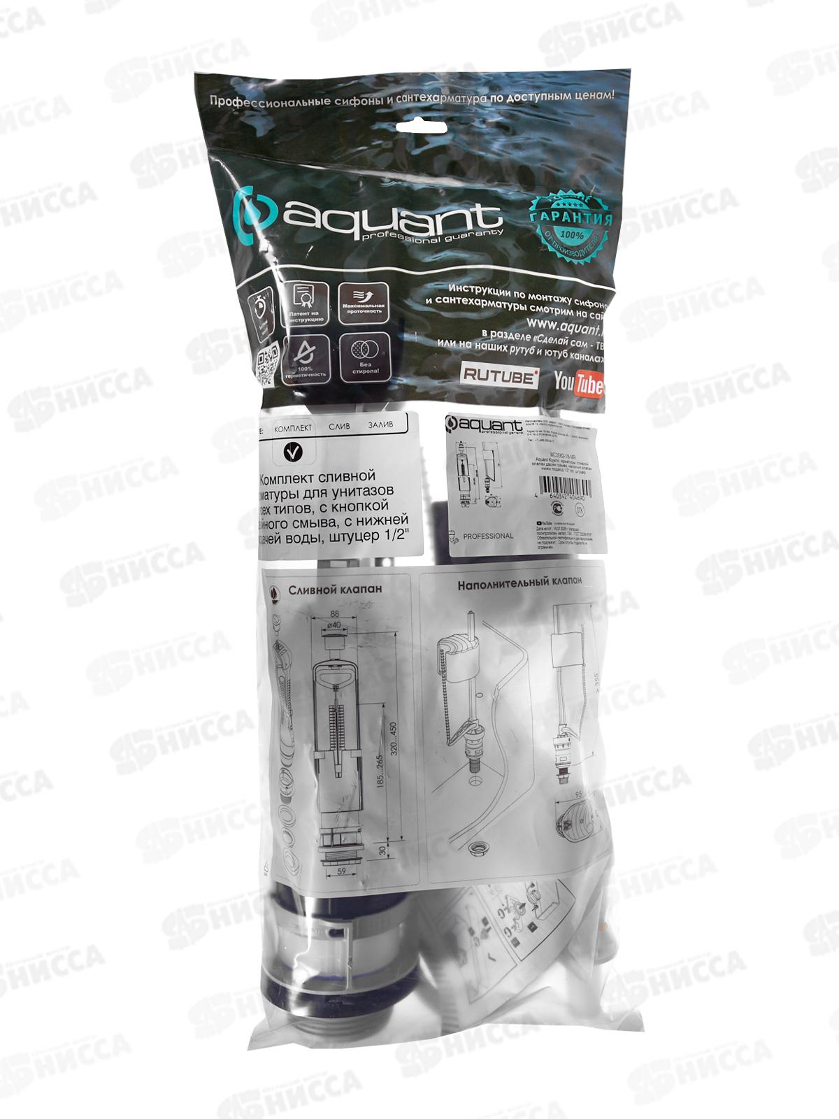 Комплект арматуры Aquant включает: 1. Спускной клапан с кнопкой двойного слива с регулировкой объема полного и половинного слива. Хромированная кнопка фиксирует керамическую крышку бачка с возможностью смещения на 30 мм по каждой оси. Предназначен для бачков с отверстием диаметром около 40 мм. Конструкция с байонетной системой обеспечивает простоту обслуживания, бесшумную работу и высокую скорость слива. Основной элемент - силиконовое уплотнительное кольцо, сохраняющее эластичность и предотвращающее протечки. 2. Наполнительный клапан с нижней подводкой воды с пластиковым штуцером ?". Поршневая механическая система запирания с простой установкой и регулировкой. 3. Крепежная система для монтажа бачка к унитазу: оцинкованные винты 70 мм, пластиковые шайбы (2 шт.), конические уплотнения, прокладки, пластиковые барашки, гайки и уплотнительное кольцо для компенсации неровностей керамики.